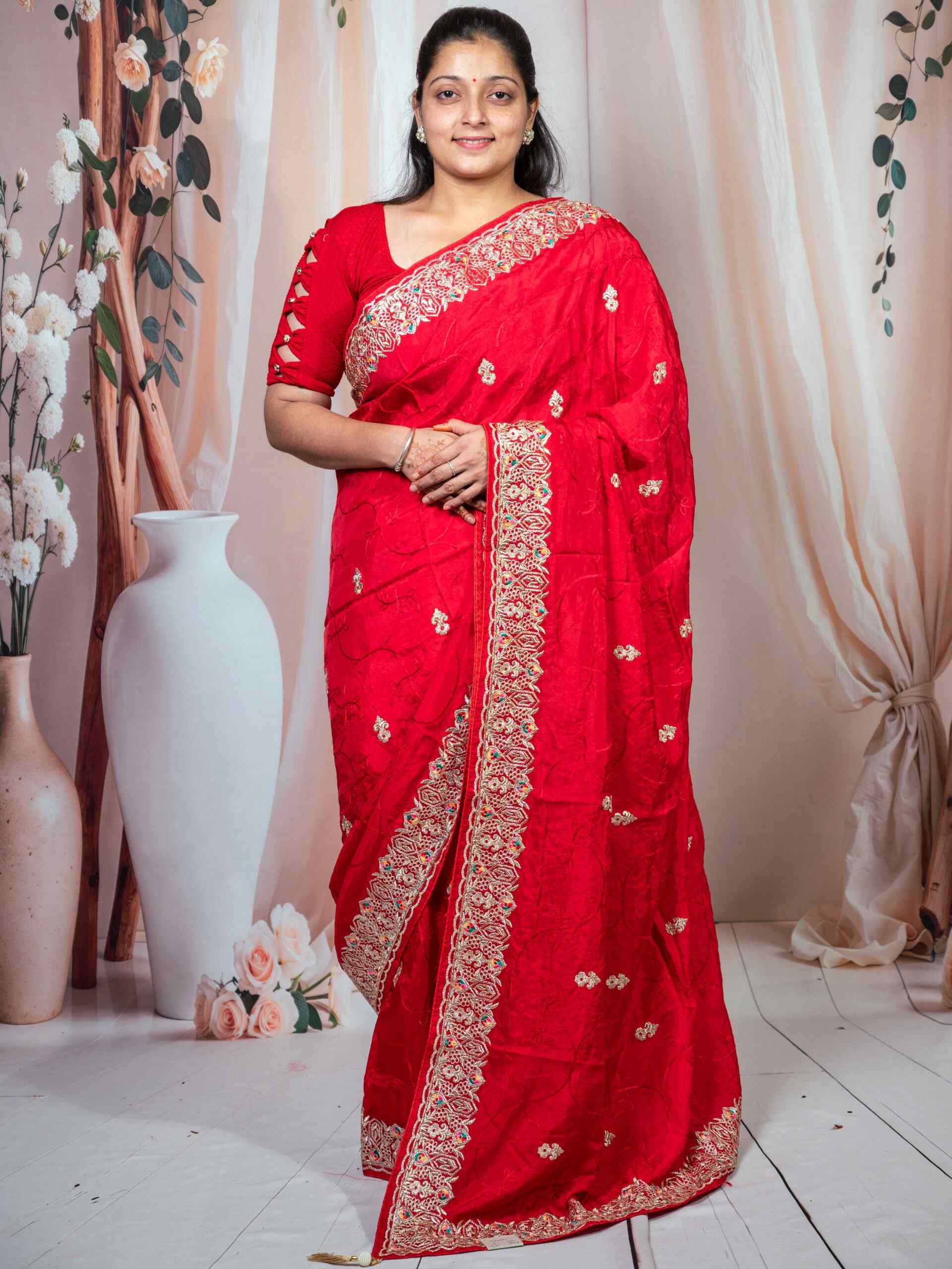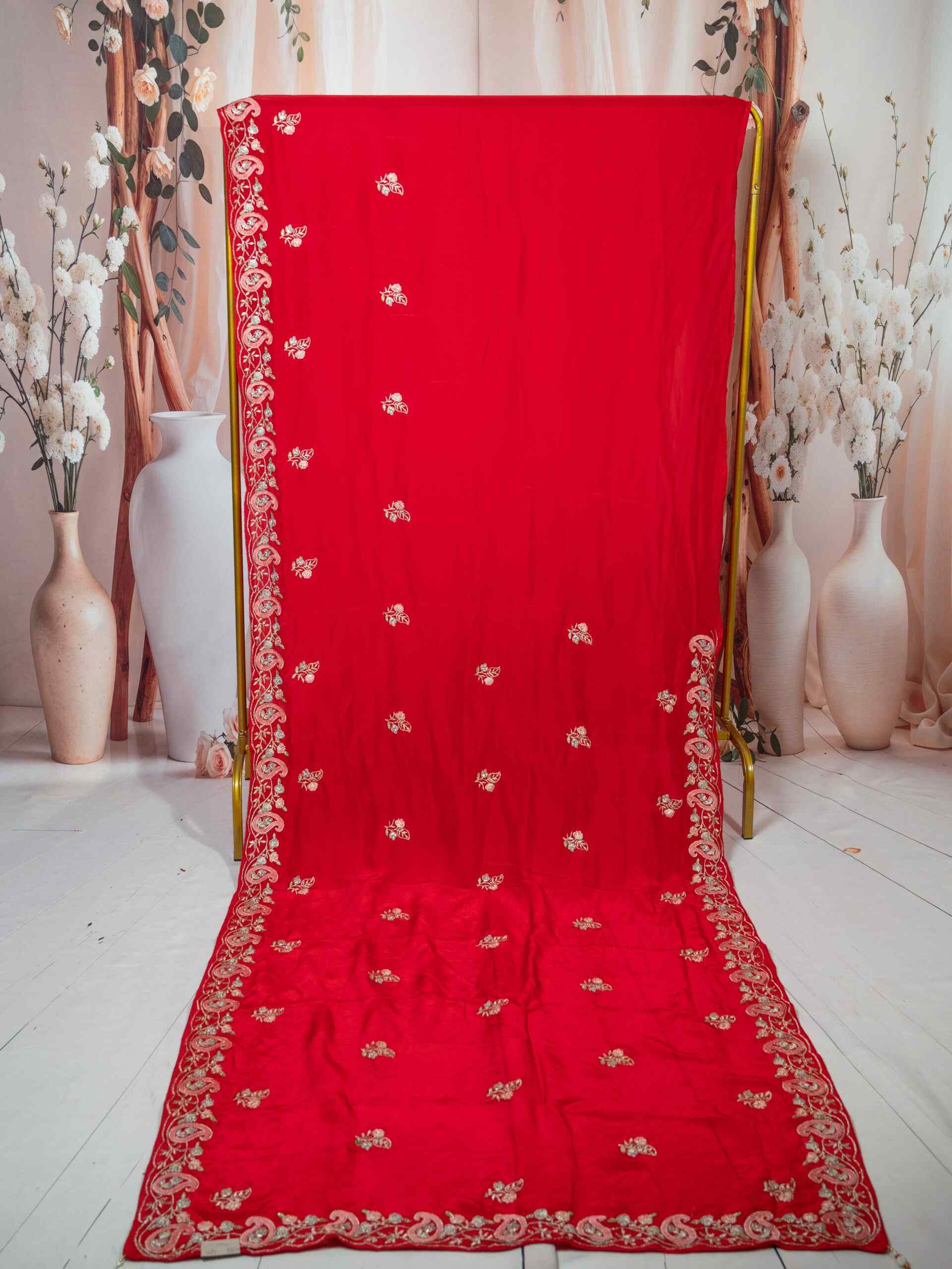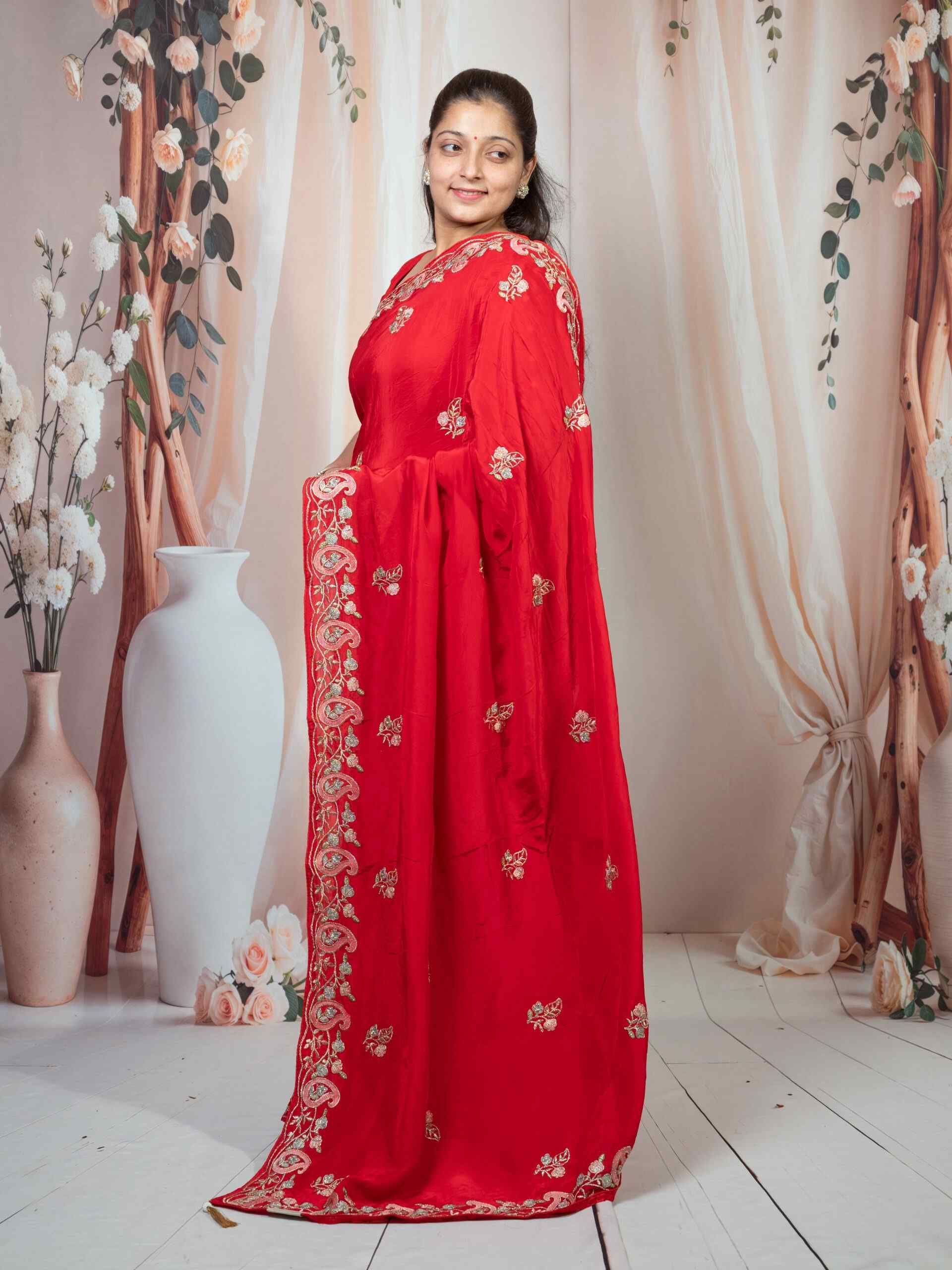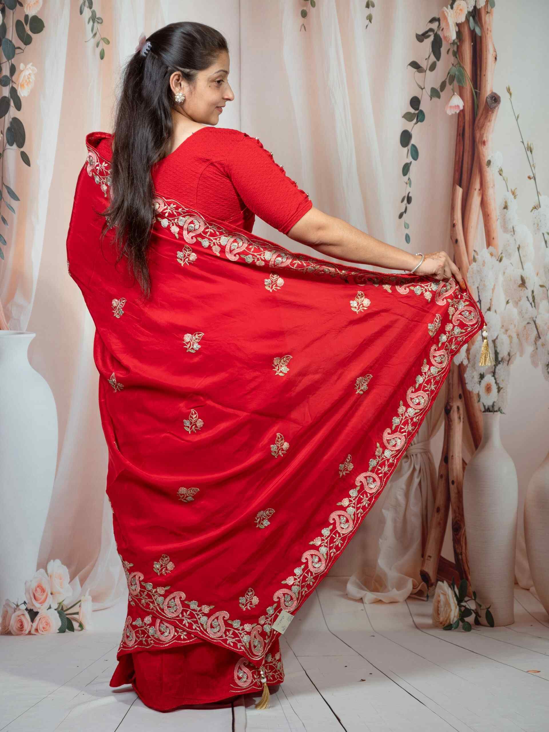 Beautifully adorned with intricate embroidery work, this saree reflects delicate craftsmanship and adds a rich texture to its smooth silk drape. The vibrant red hue symbolizes love and celebration, making it a perfect choice for weddings, festive occasions, and cultural gatherings.