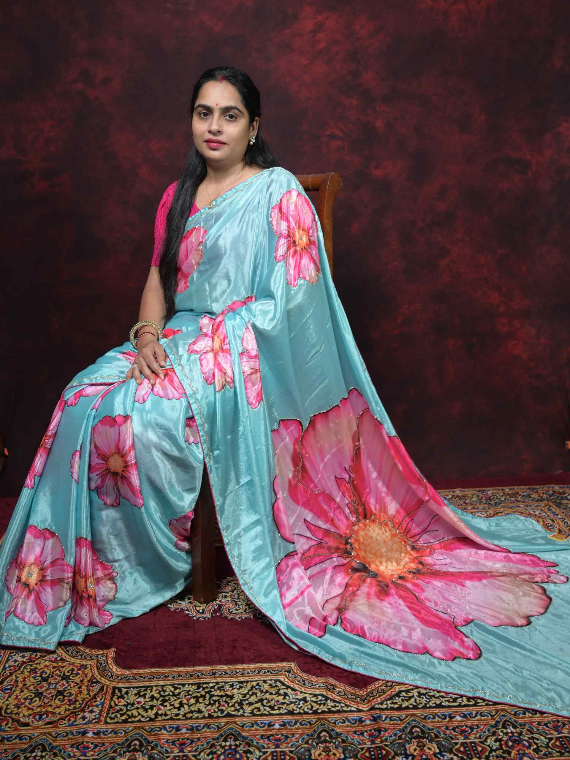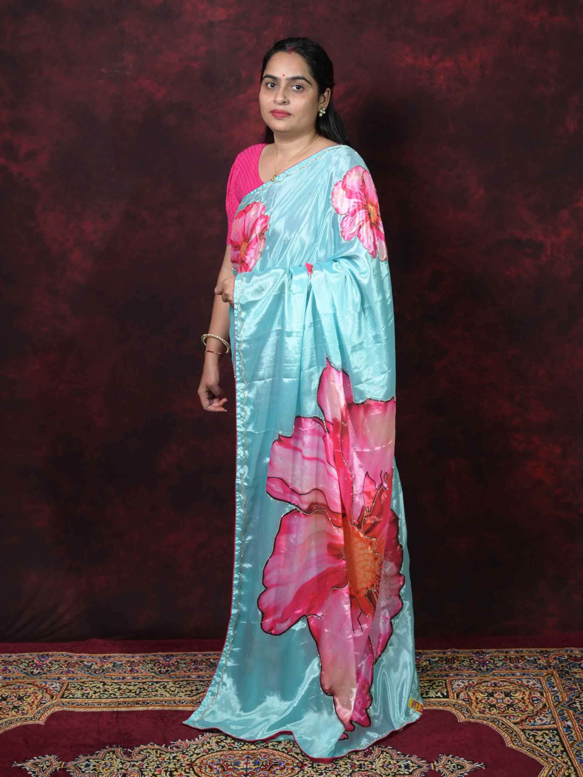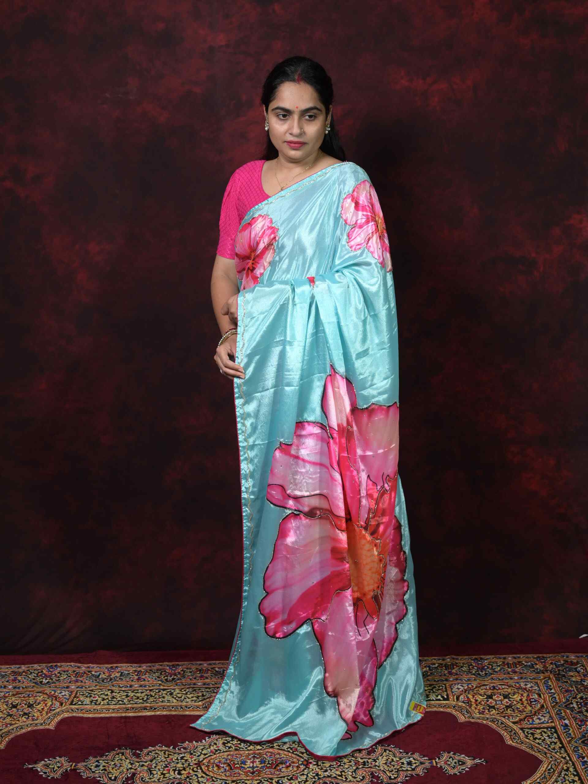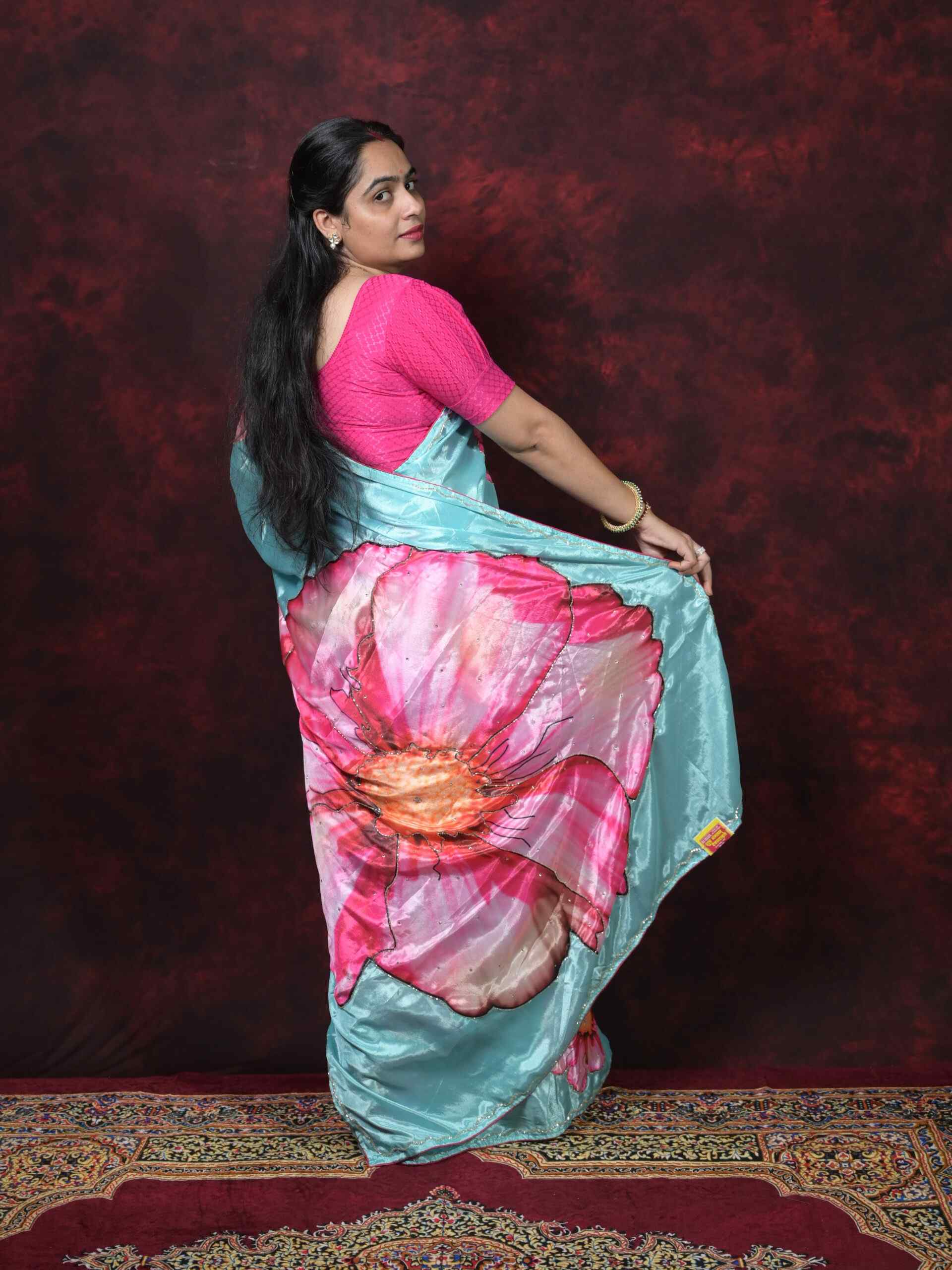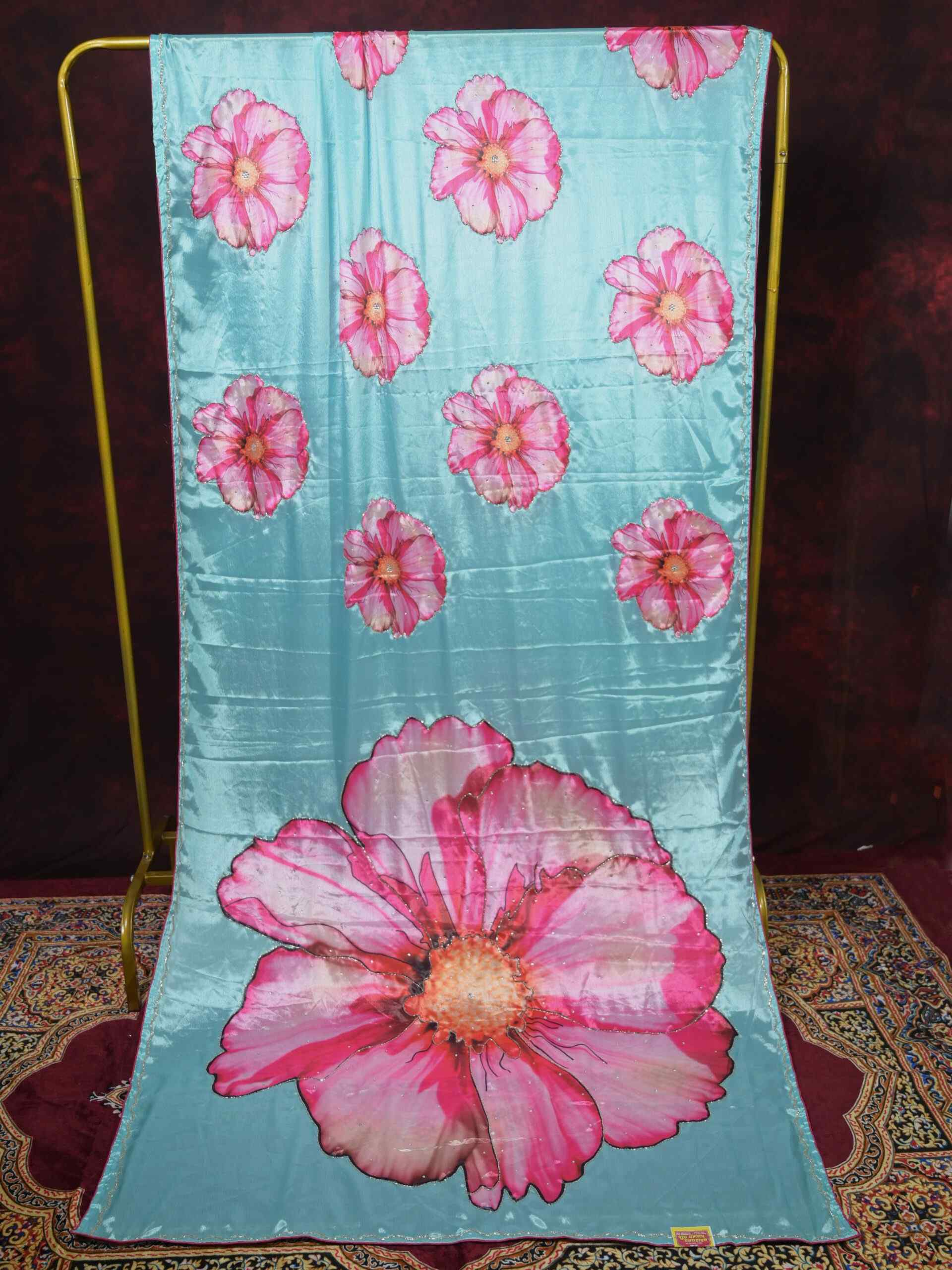 Add a touch of elegance to your wardrobe with this exquisite Sky Blue Chinnon Saree. Crafted from premium quality Chinnon fabric, this saree features stunning Digital Print patterns beautifully enhanced with Cutdana Hand Work. The lightweight and flowy fabric gives a rich and graceful drape, making it perfect for festive occasions, parties, and celebrations.