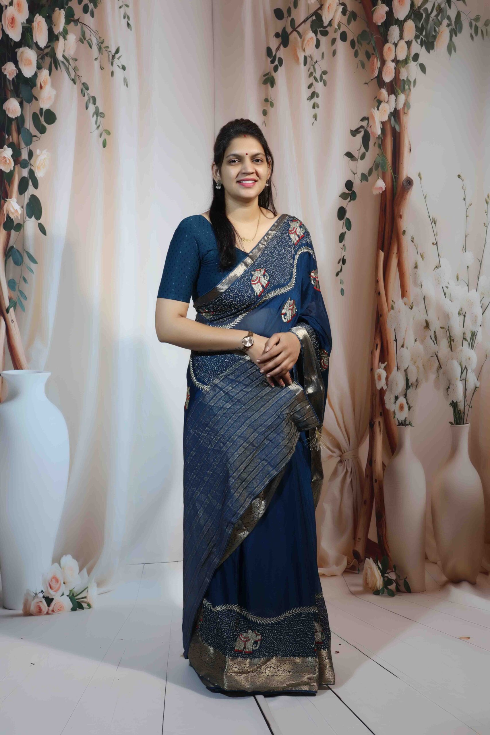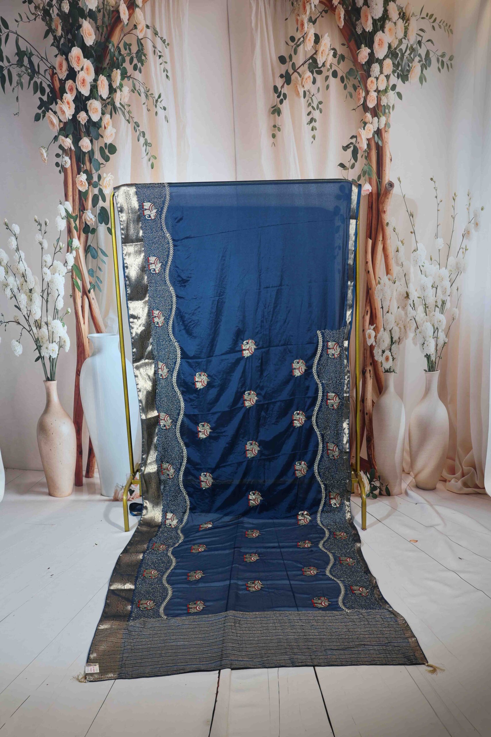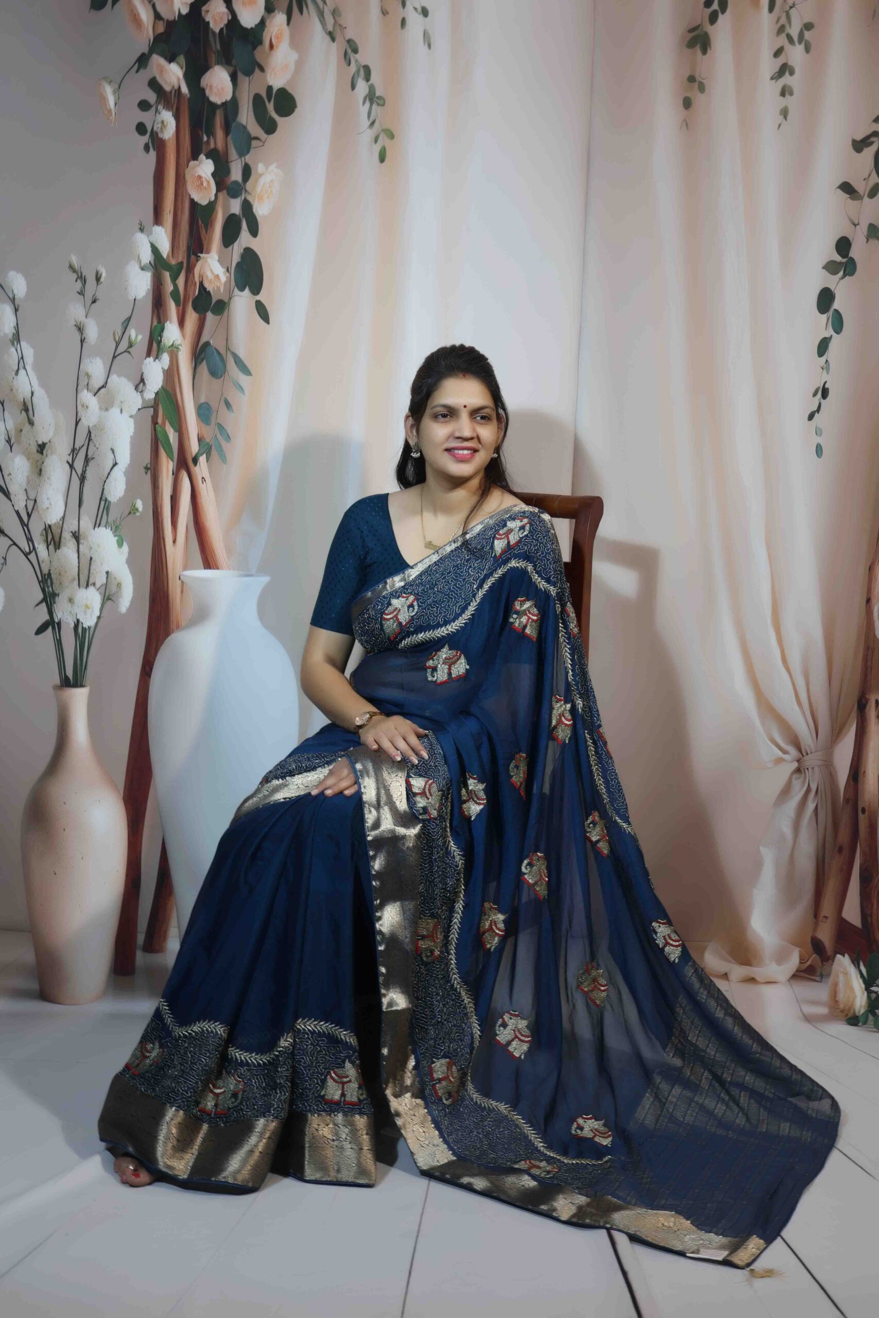 Blue Chinnon Saree with Weaving Jari Work & Jaquard Border | Elegant Traditional Saree 6.25m