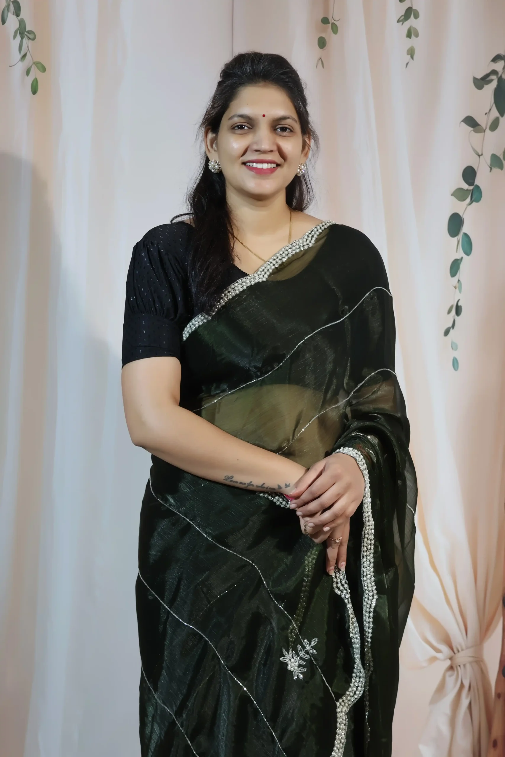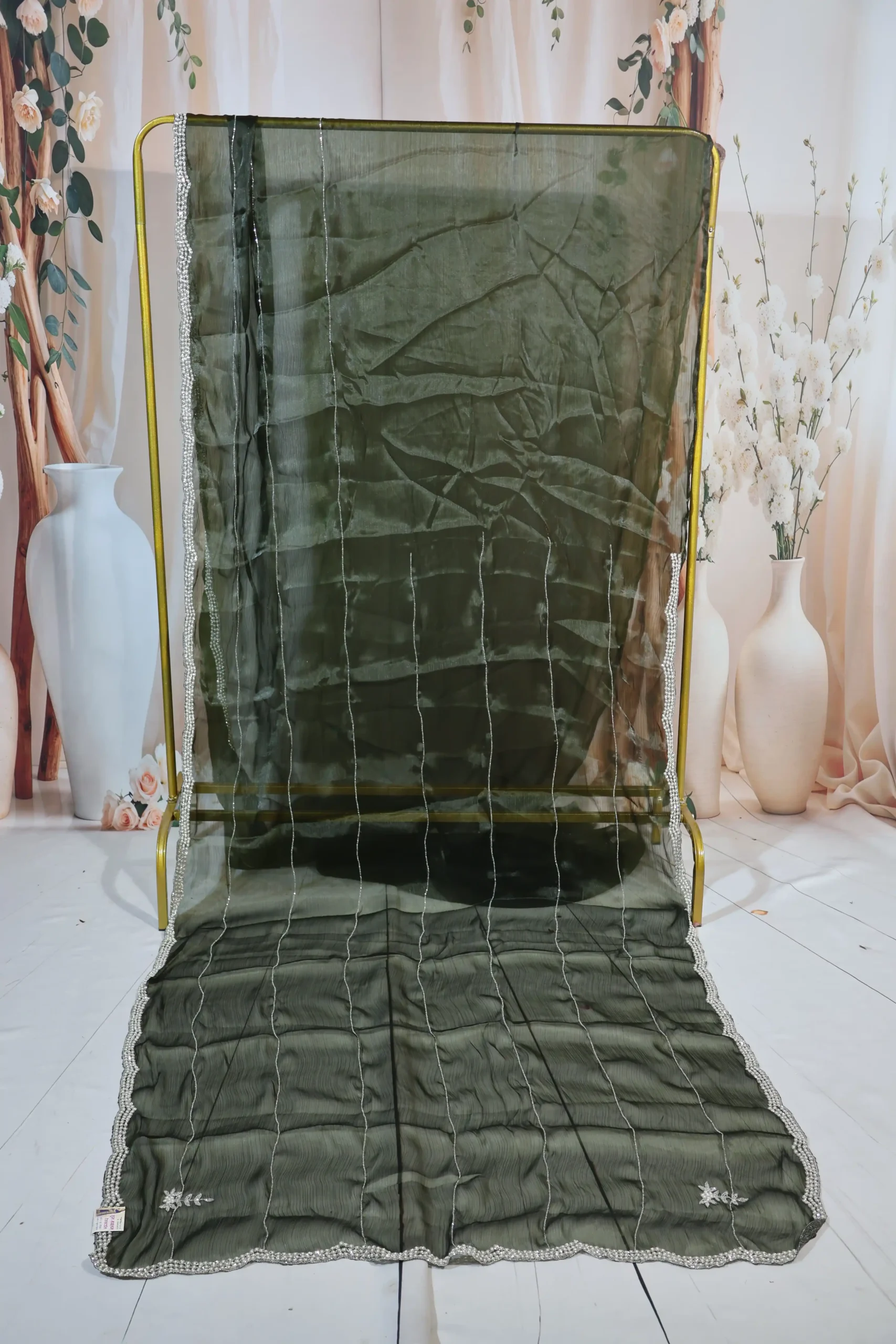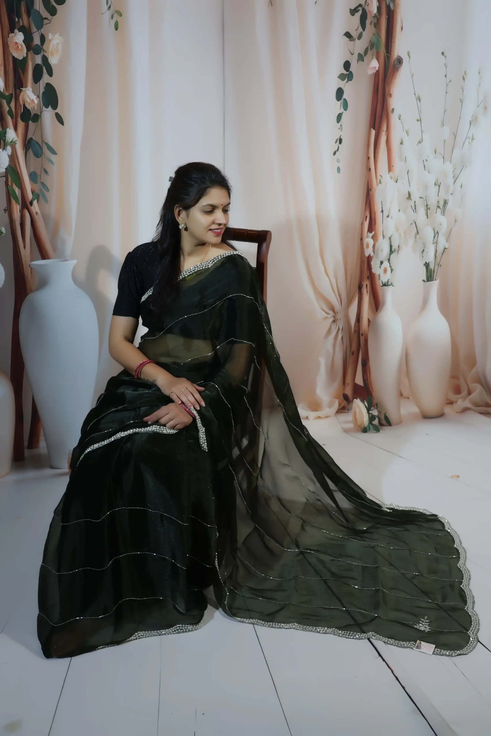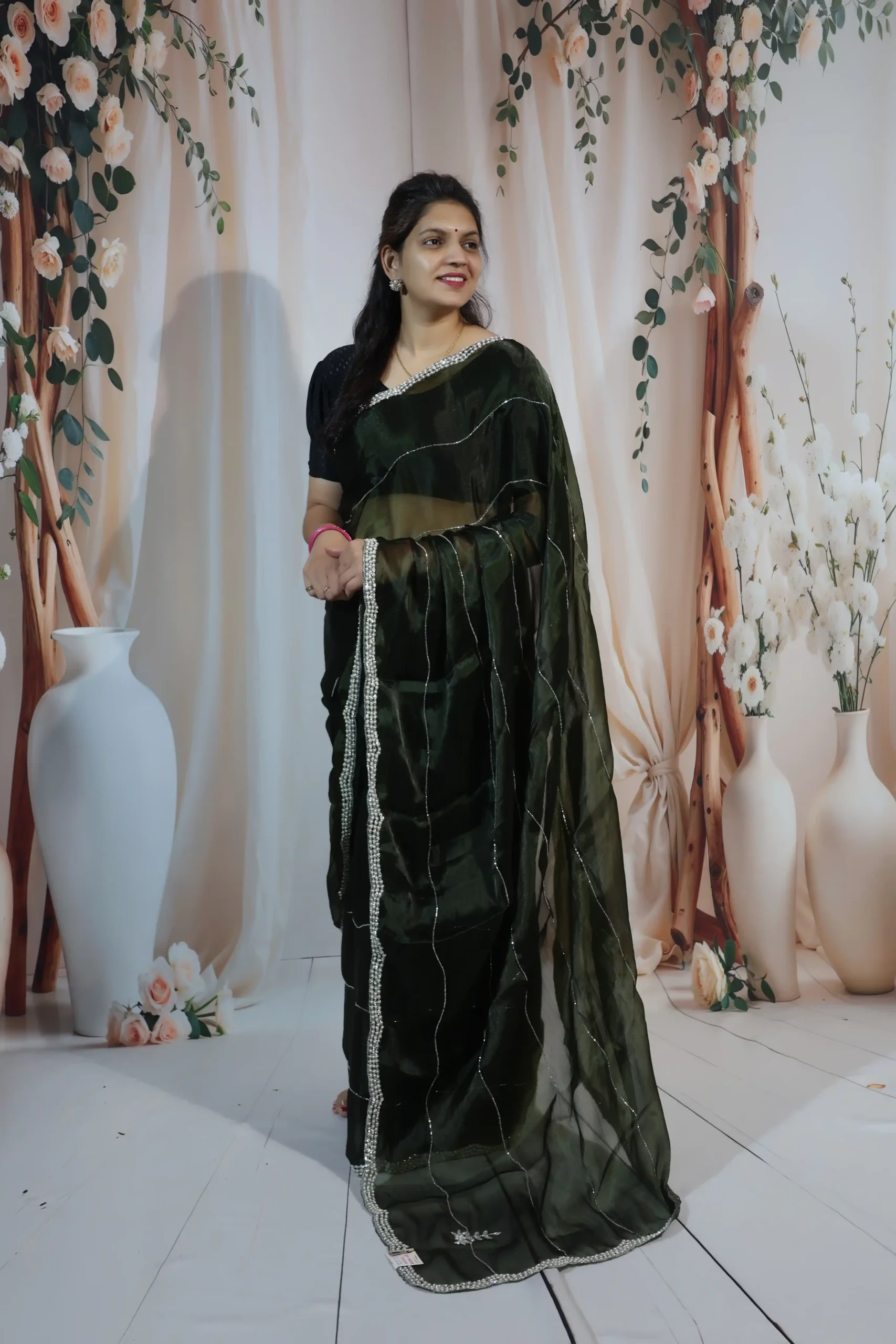 Stunning Bottle Green Fandy Fabric saree featuring intricate Cut Dana work. Lightweight and elegant, perfect for parties, weddings, and festive occasions.