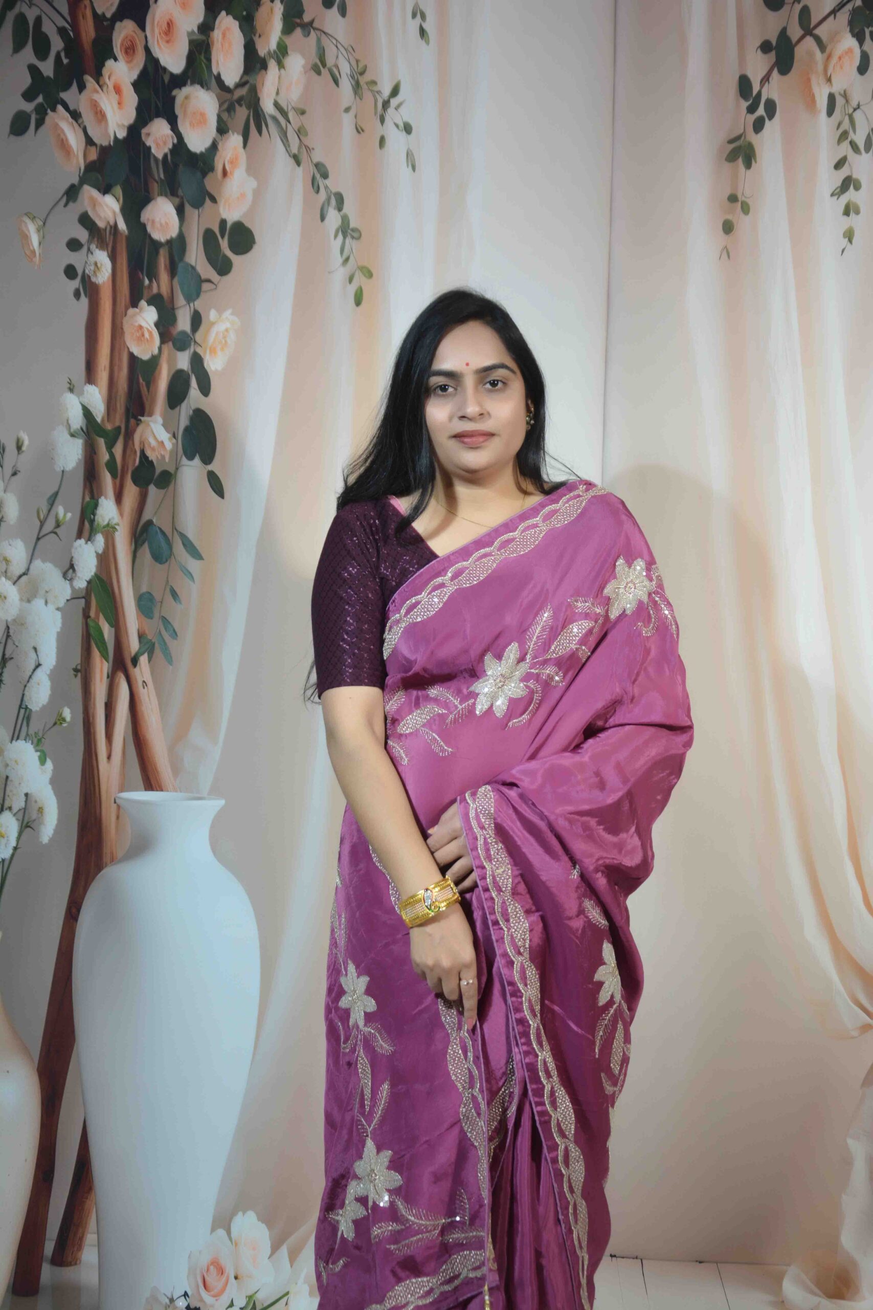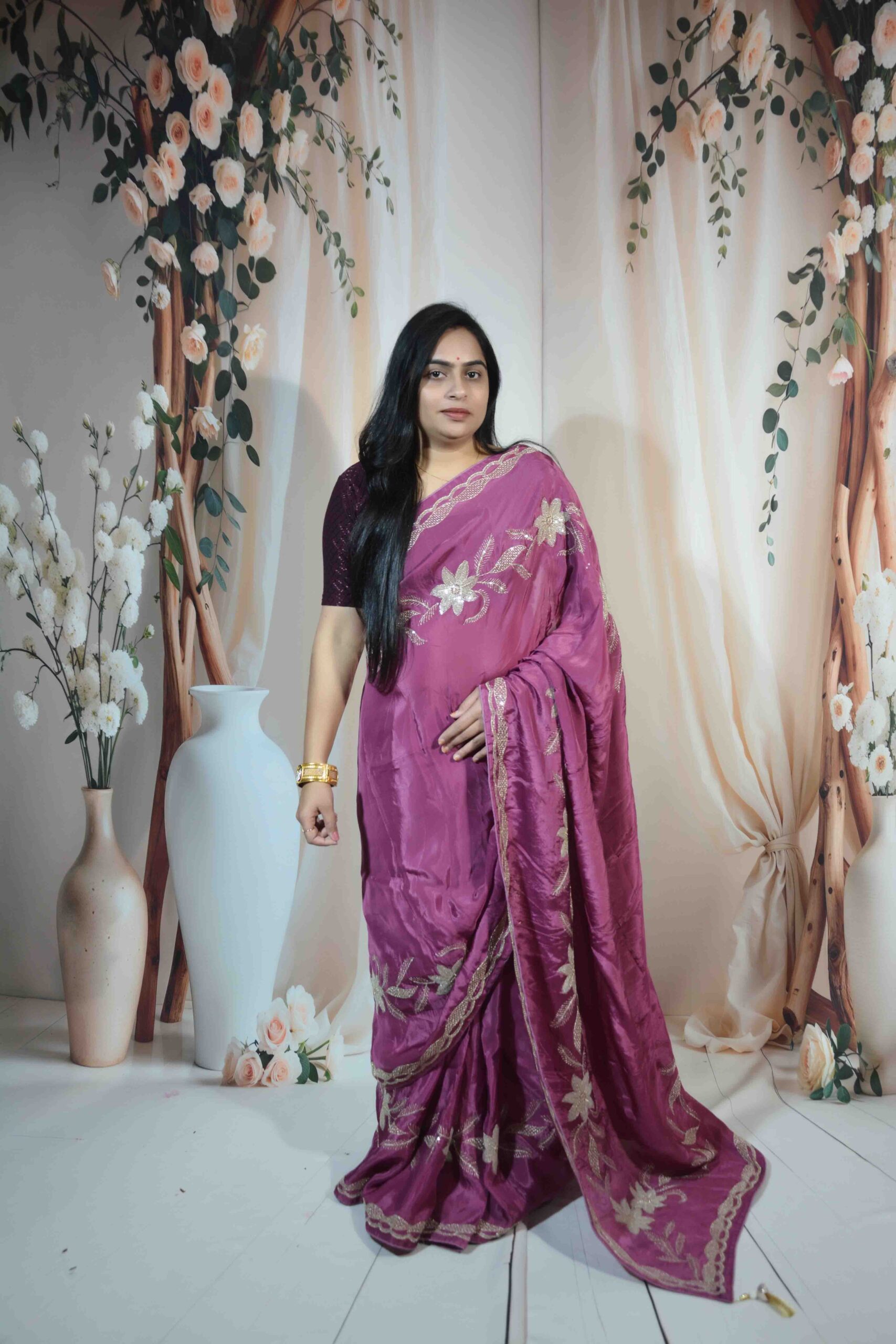 Crafted from high-quality H/O fabric, the saree feels soft, flowy, and comfortable throughout the day. Its rich purple shade gives a royal and graceful vibe, while the handcrafted floral embroidery enhances the overall elegance.