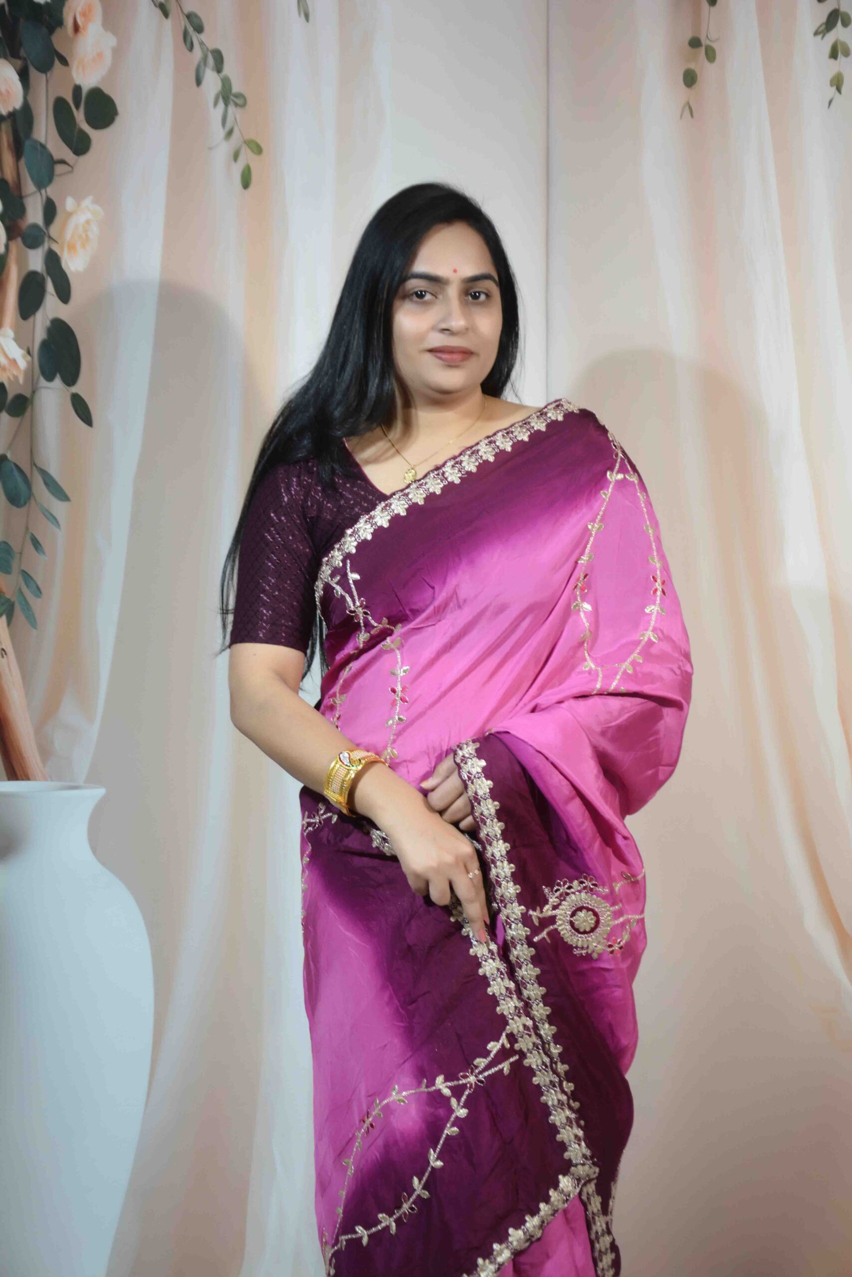 The saree features exquisite Gotta Patti embroidery, giving it a traditional Rajasthani touch that enhances its festive and luxurious appeal. The striking majenta color adds richness and vibrancy, making it an ideal choice for weddings, sangeet nights, poojas, cultural functions, and festive occasions.