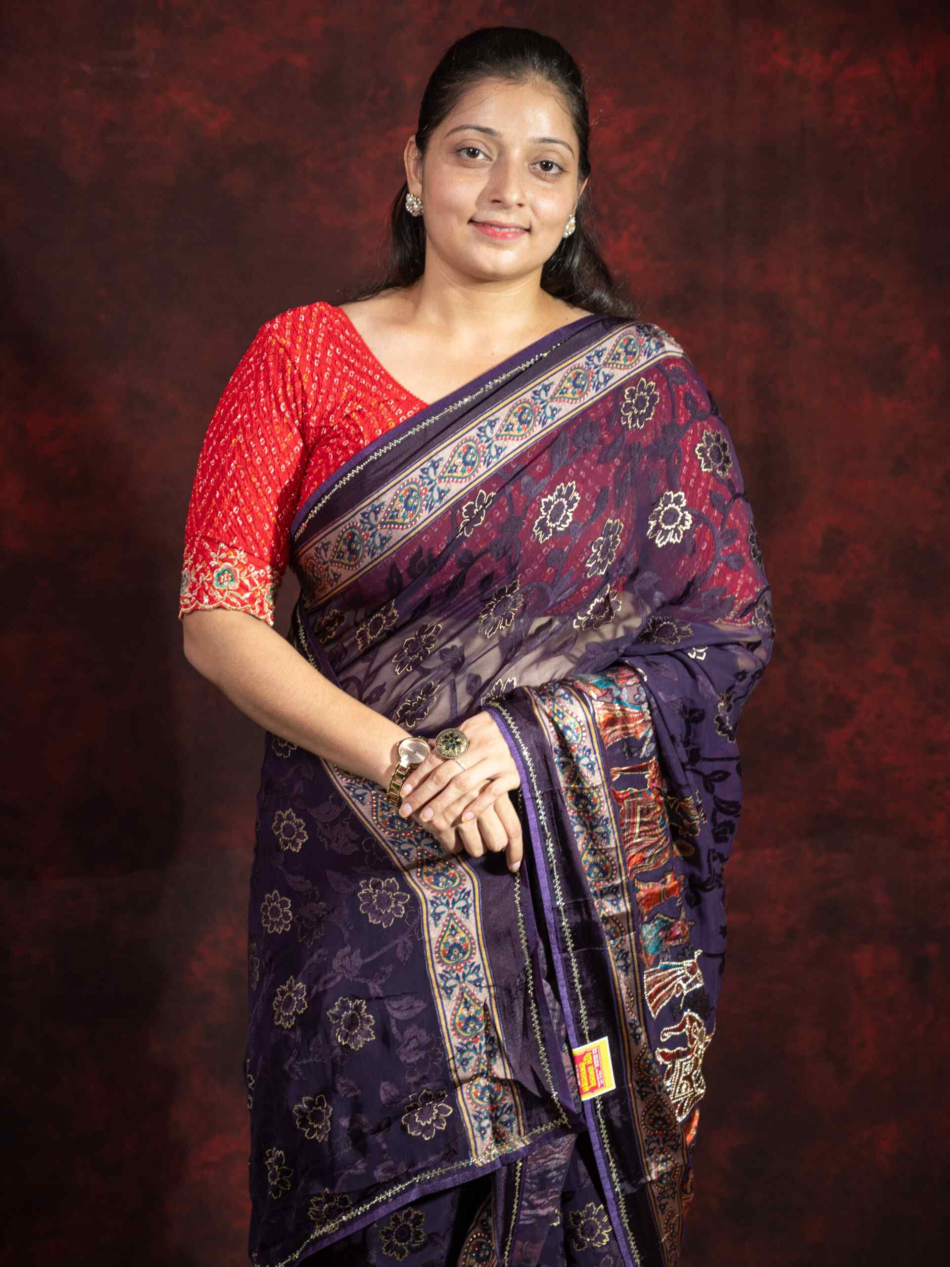 A stunning Navy Blue Razwara Style Saree in premium Brasso fabric, featuring stone work and traditional Rajasthani Hathi–Ghoda–Palki border print. Perfect for festive and party occasions.
