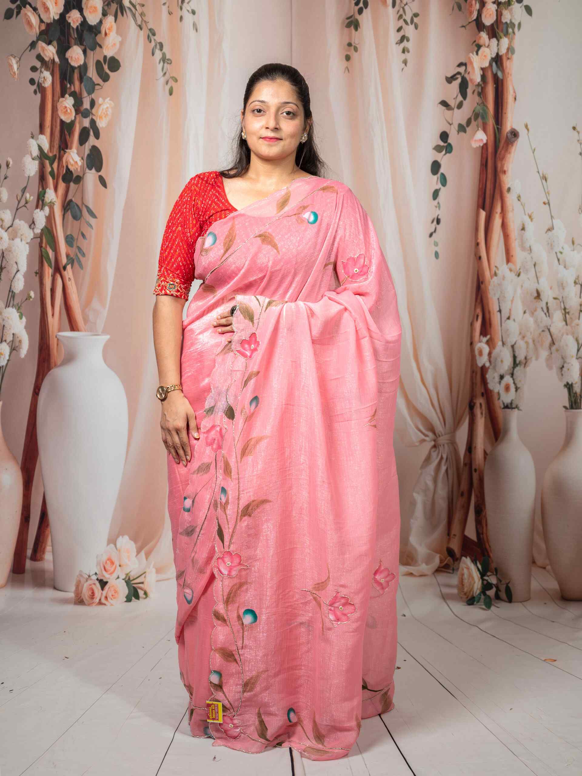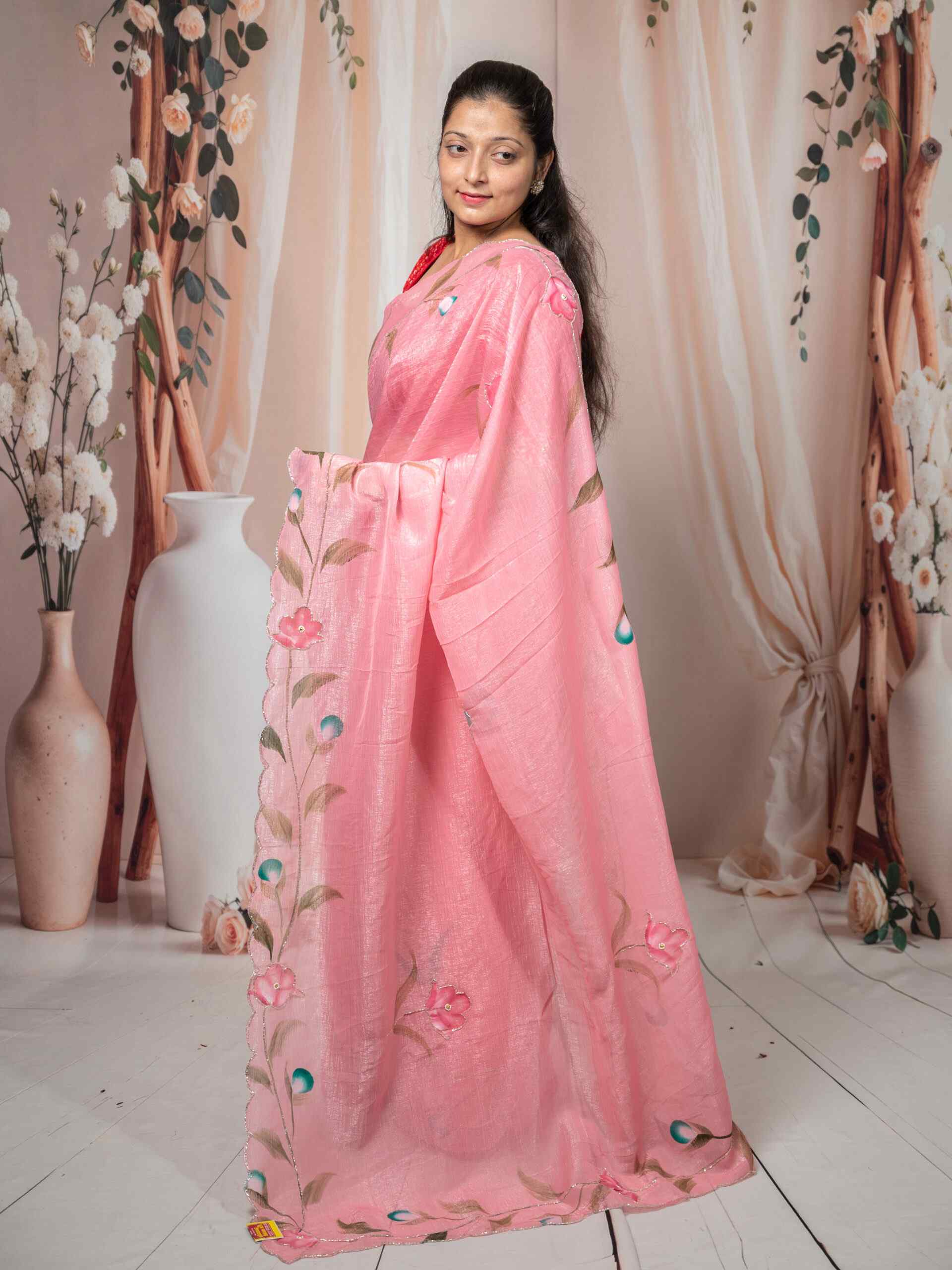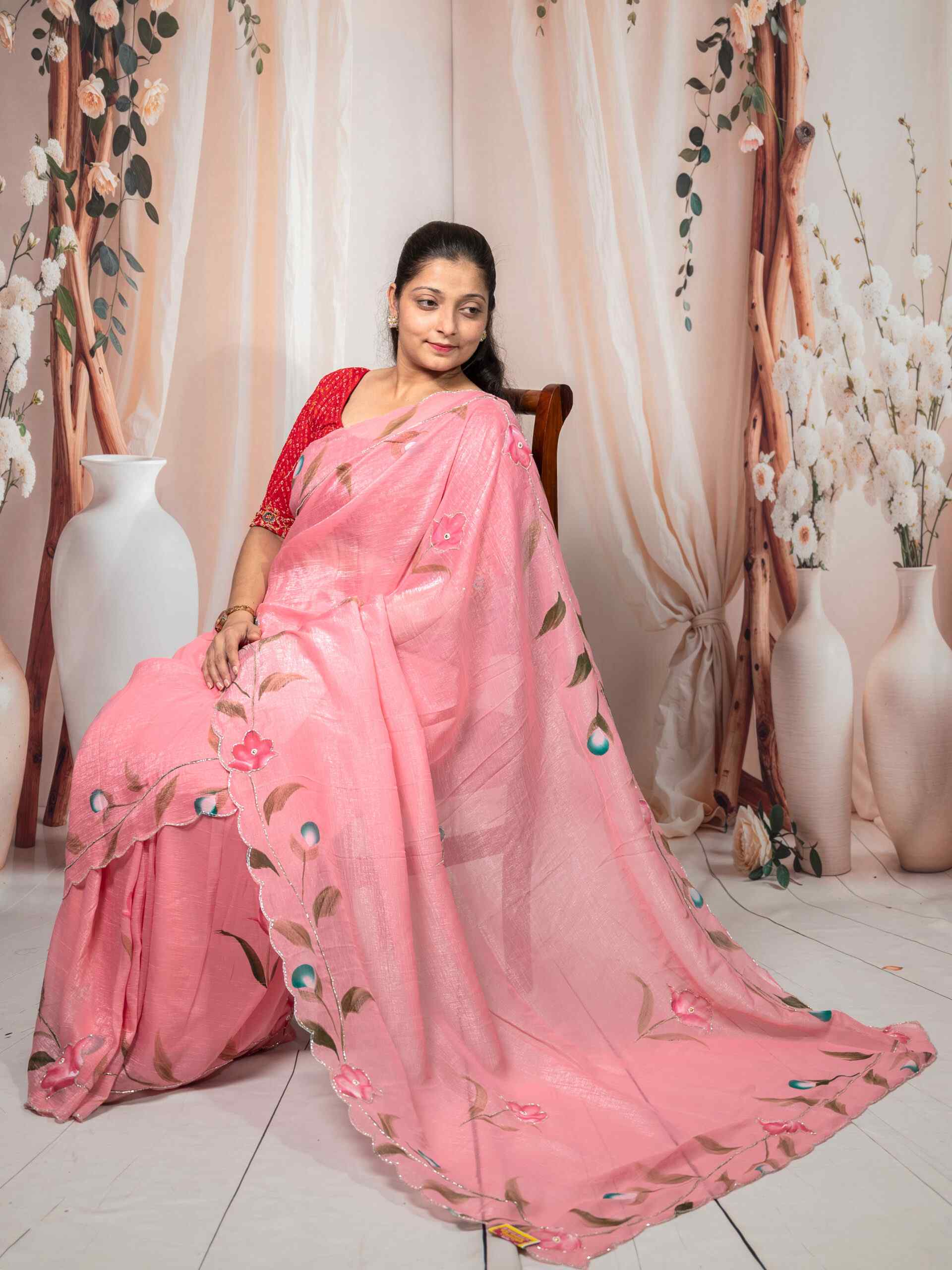Beautiful pink Crunchy saree featuring artistic brush paint floral pattern with delicate cut dana handwork. Perfect for parties, festive wear, and special occasions.
