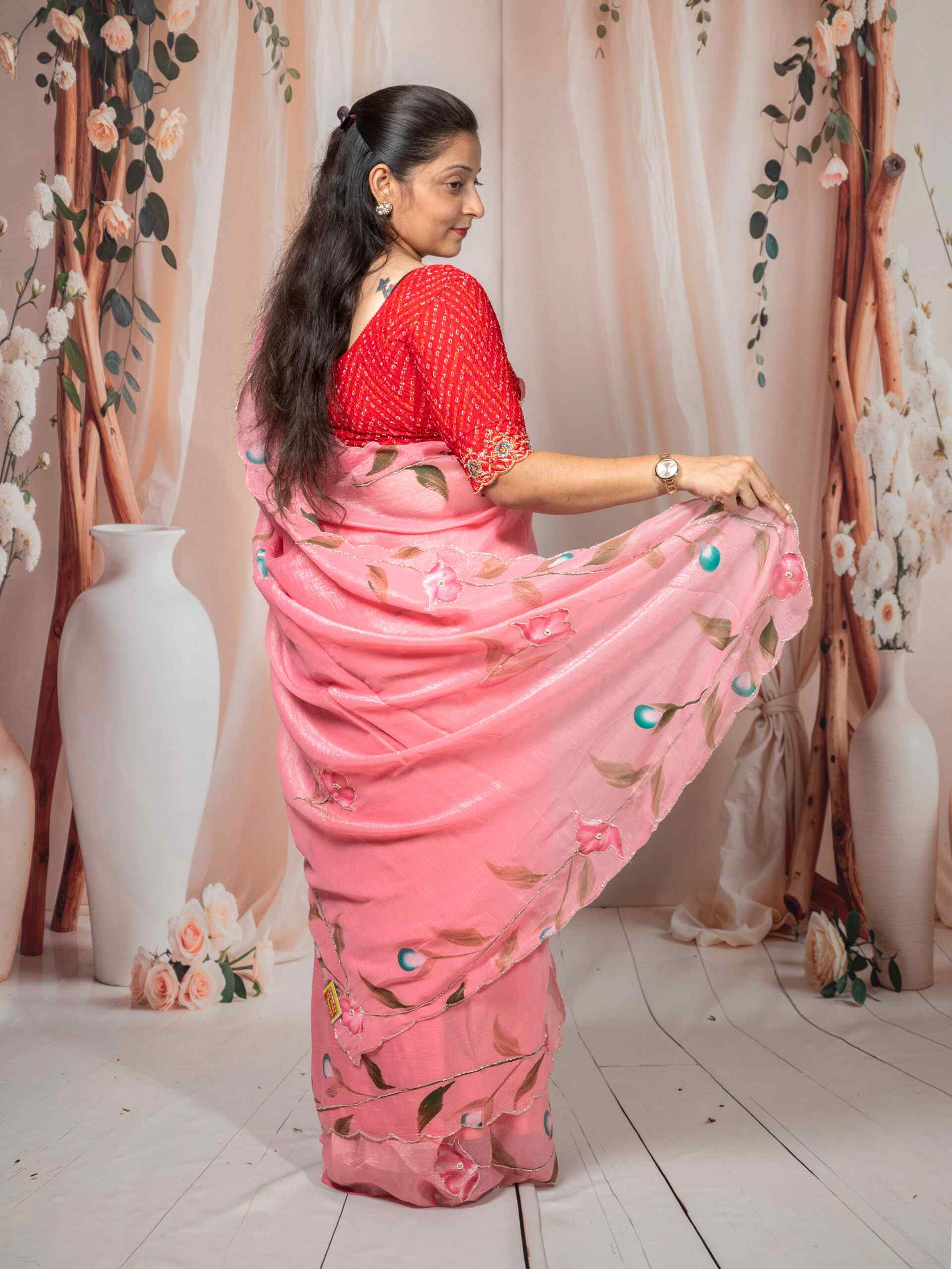 The saree is enhanced with fine cut dana handwork, adding a subtle shimmer that elevates its festive appeal. The beautiful floral brush paint design brings a modern yet ethnic charm, making it perfect for celebrations, parties, and special gatherings.
