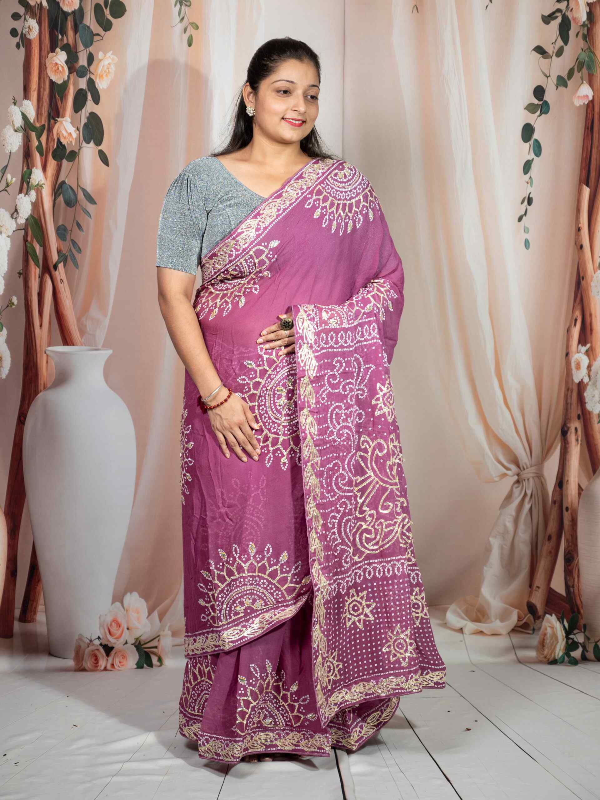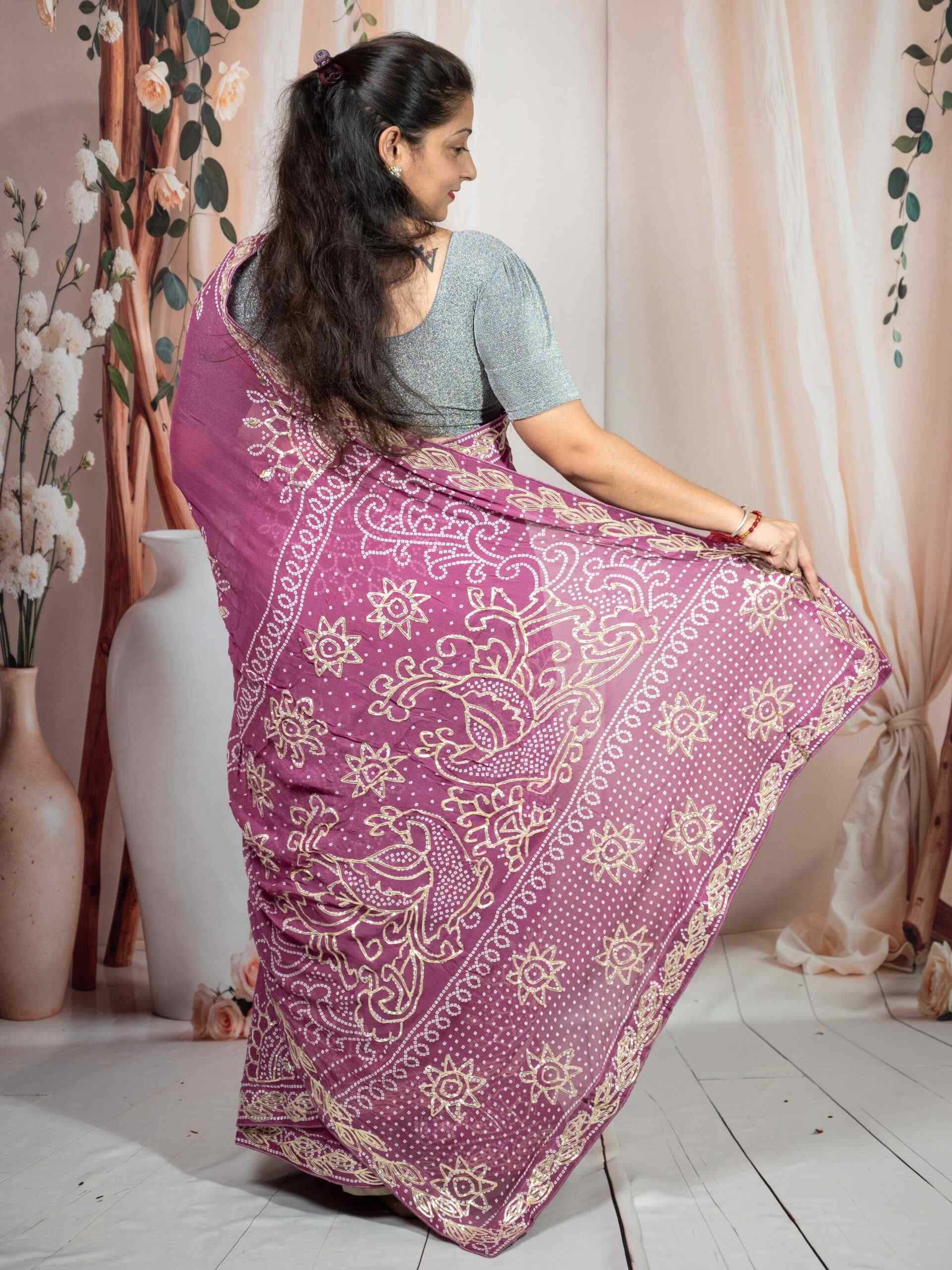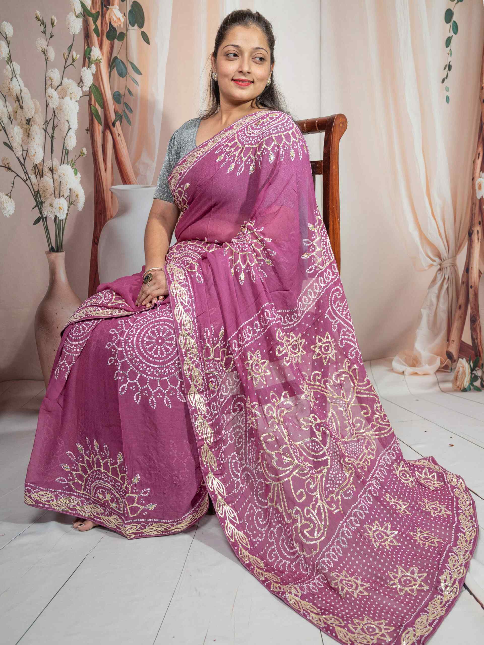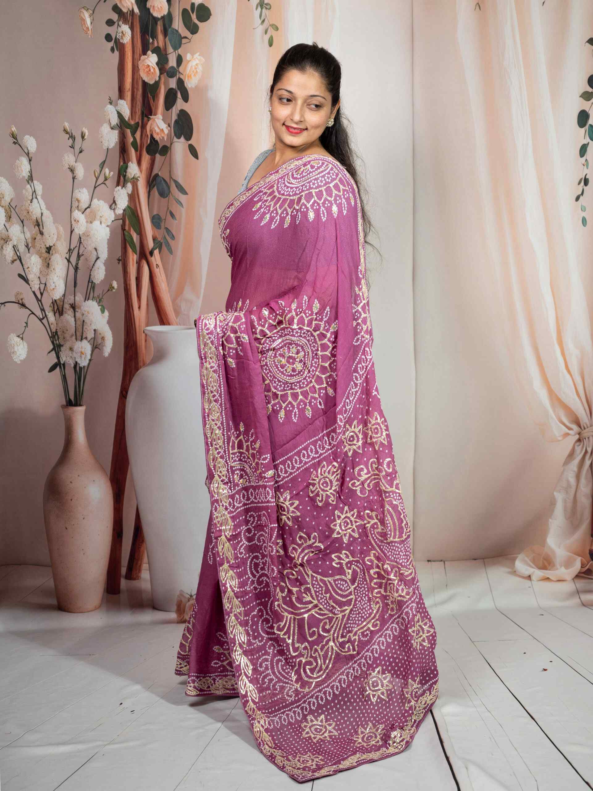 Beautiful Pink Pure Georgette saree featuring traditional Bandhani pattern with intricate Kachhi Gota Patti work. Perfect for festive events, weddings, and cultural occasions.