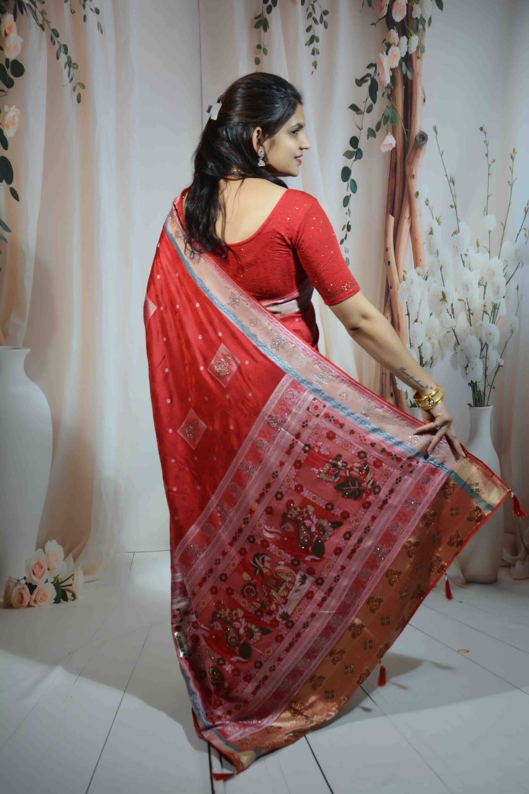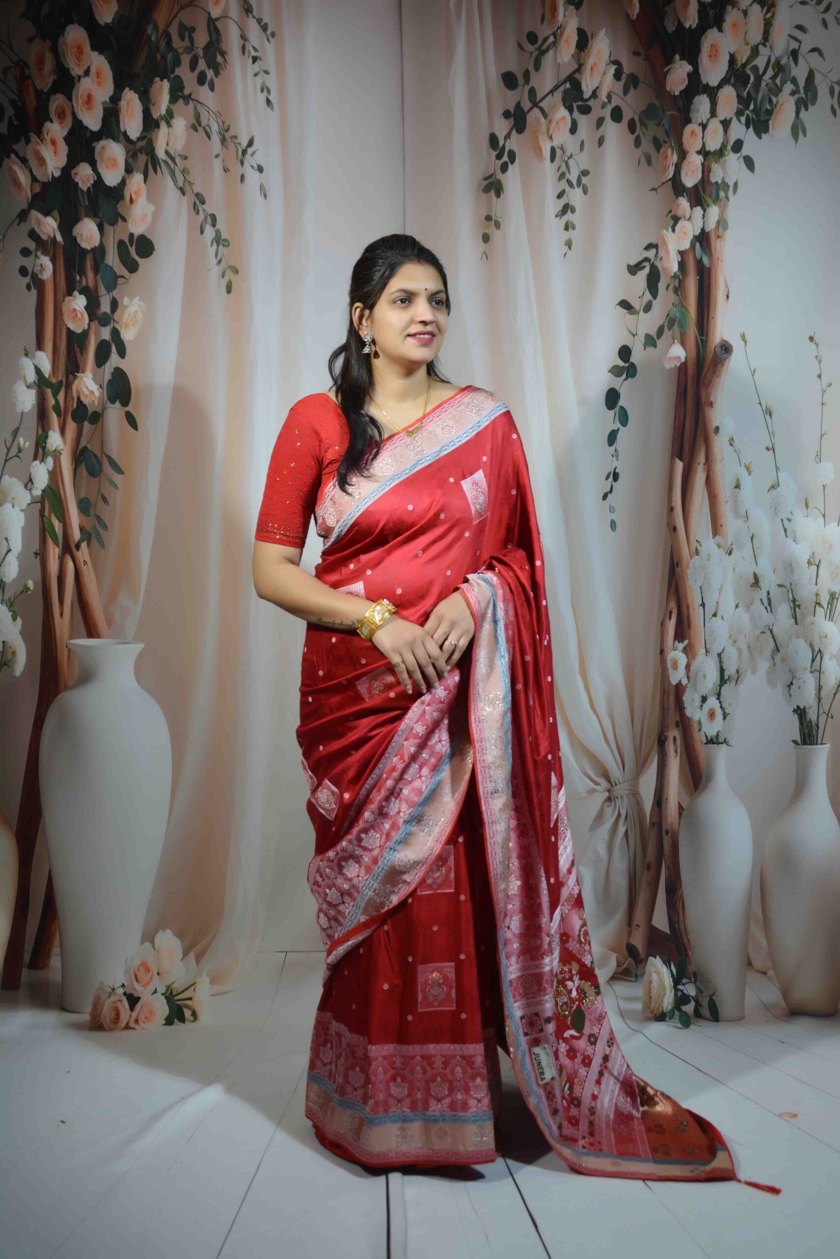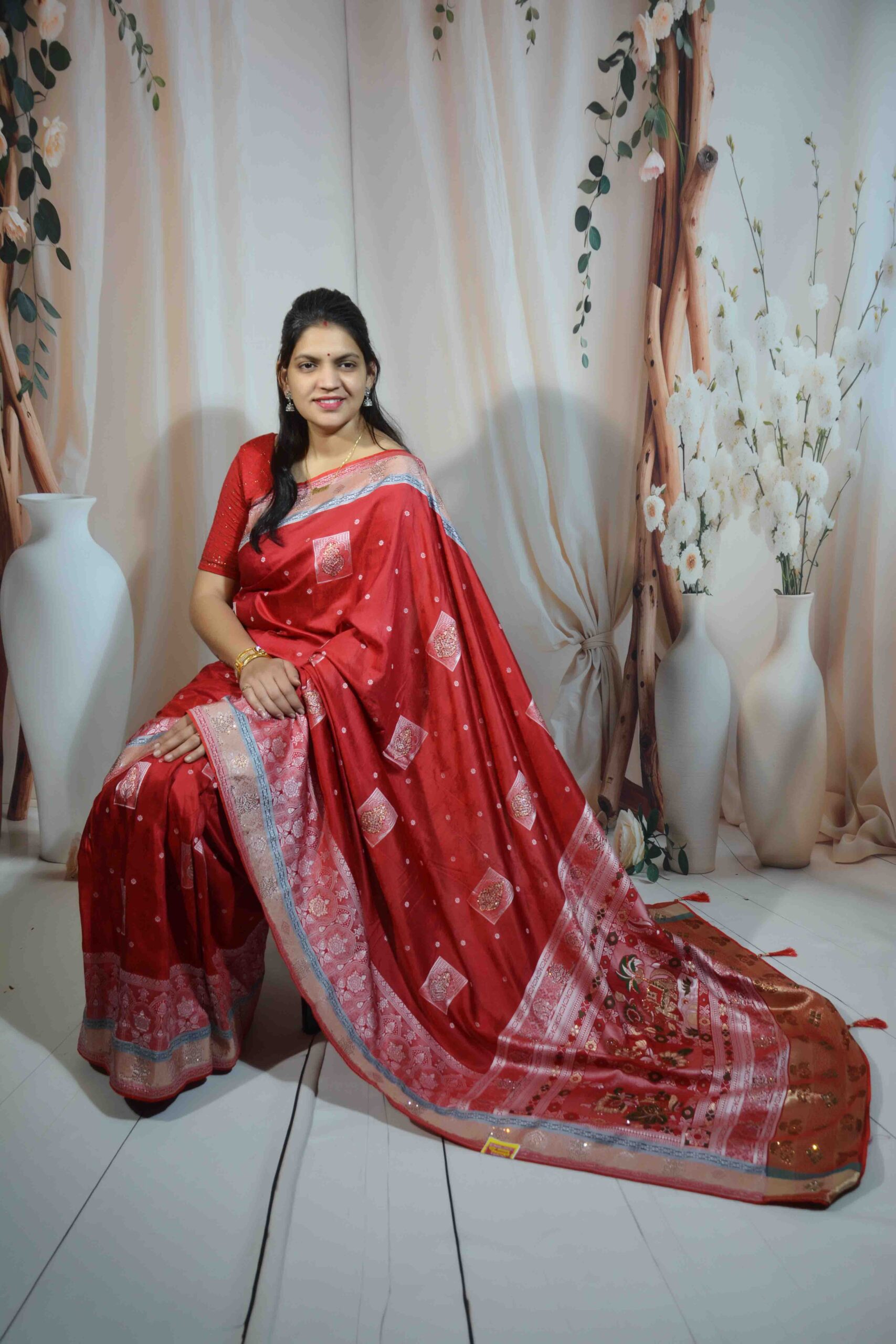 Experience timeless elegance with this stunning Red Banarasi Saree, crafted from premium Dola Silk that offers a luxurious shine and smooth, graceful drape. Known for its rich texture and comfort, Dola Silk makes this saree both beautiful and easy to wear for long hours.