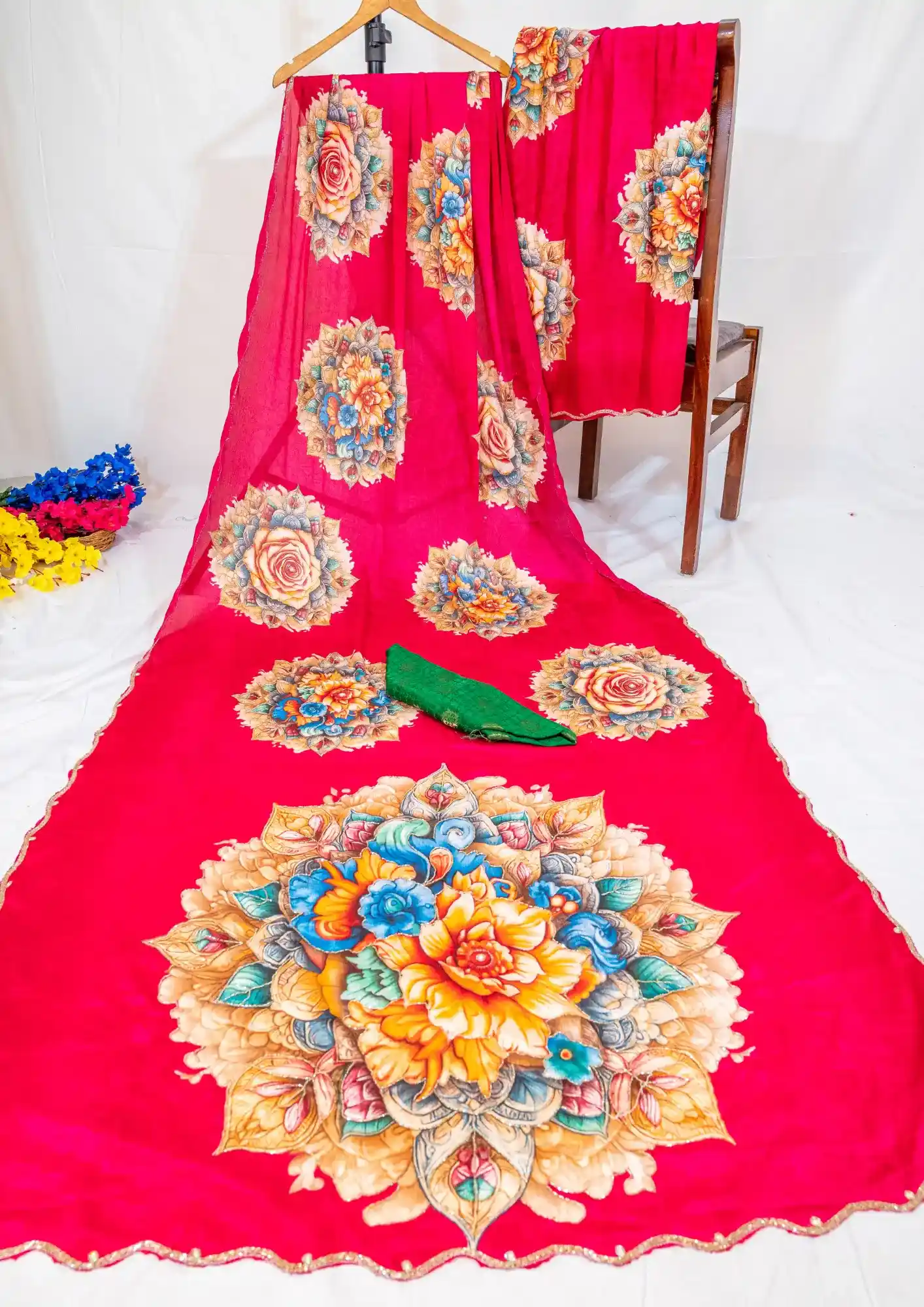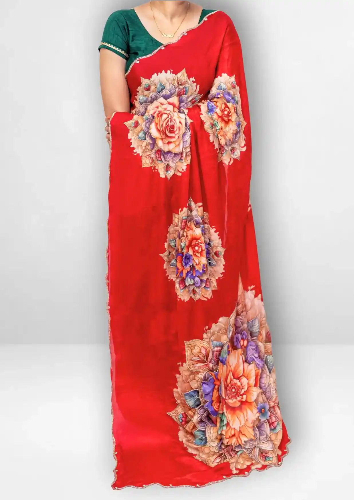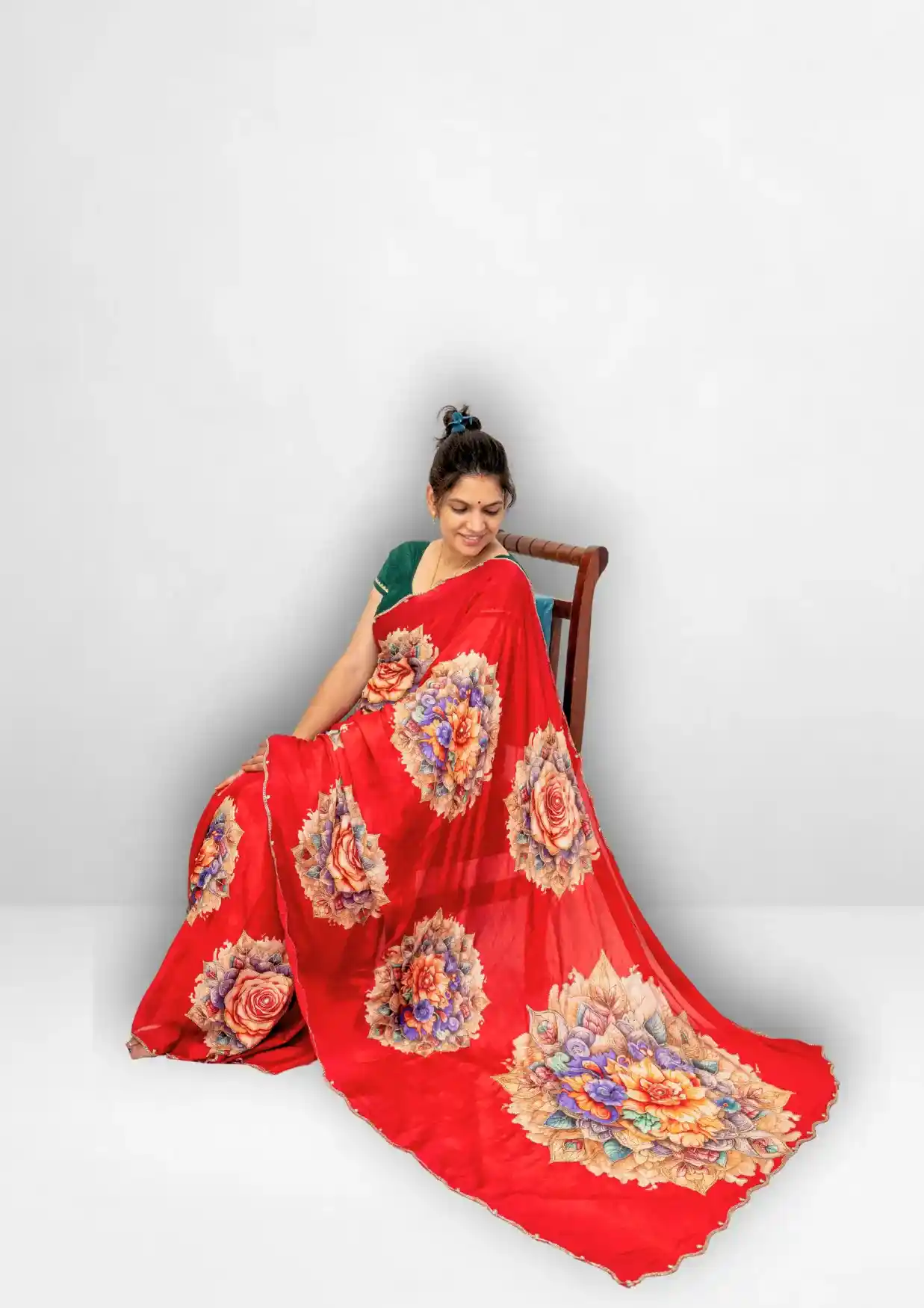 Beautiful Red Chinnon saree featuring premium handwork and a stunning big floral pallu design. Lightweight, soft, and perfect for festive wear, parties, and special occasions.