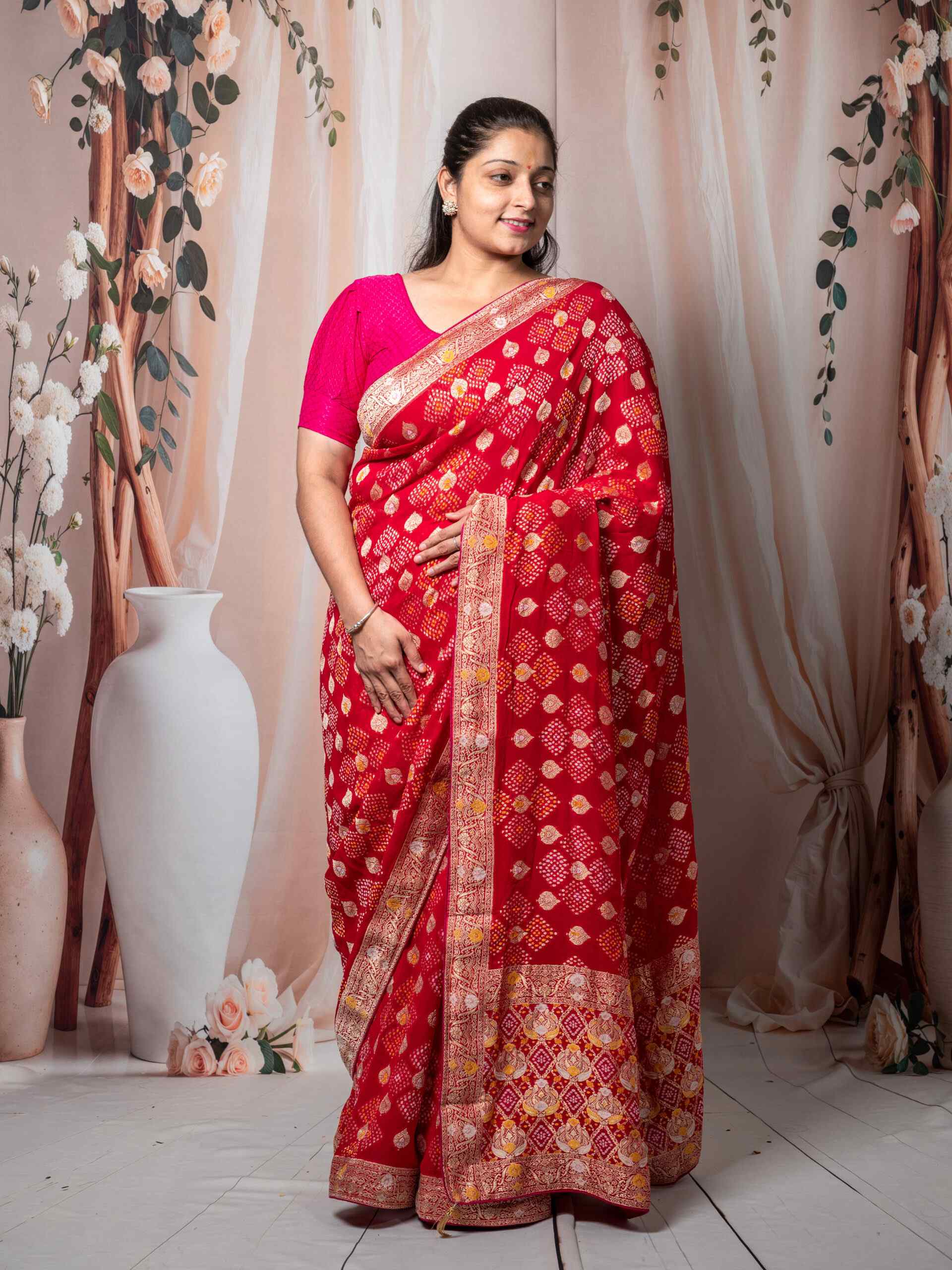 This elegant red saree is crafted from premium Royal Georgette and features intricate Jacquard weaving with traditional Bandhani print. Ideal for weddings, festive occasions, and cultural celebrations.