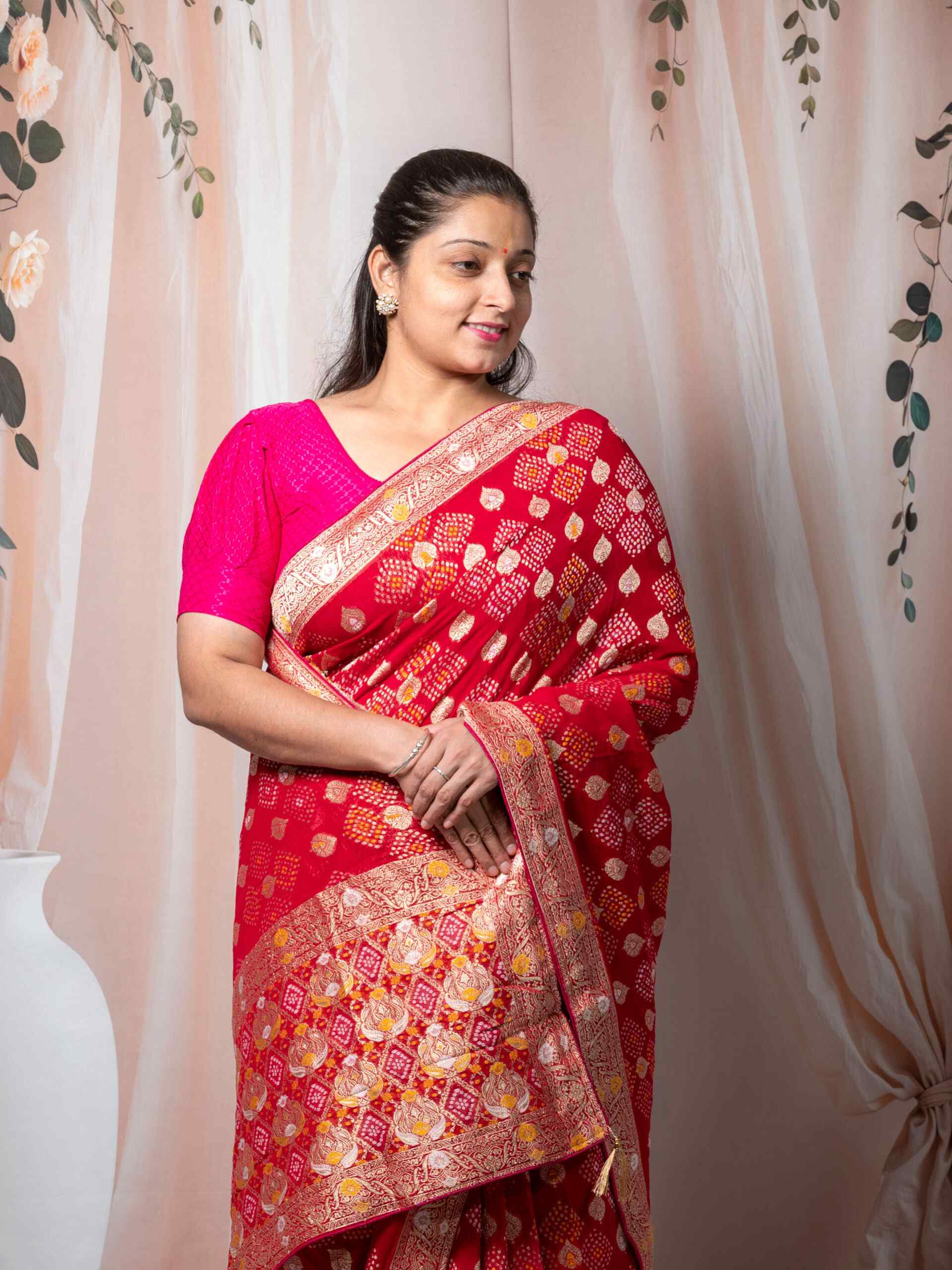 Red Royal Georgette Saree with Jacquard Weaving & Bandhani Print | Traditional Festive Saree | Wedding Wear