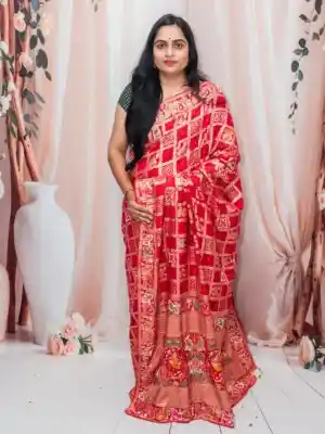 Beautiful Red Yellow Rajpooti Saree crafted from premium Simmer fabric, adorned with stunning Jari Sequence work. Perfect for weddings, festive functions, and royal traditional occasions.