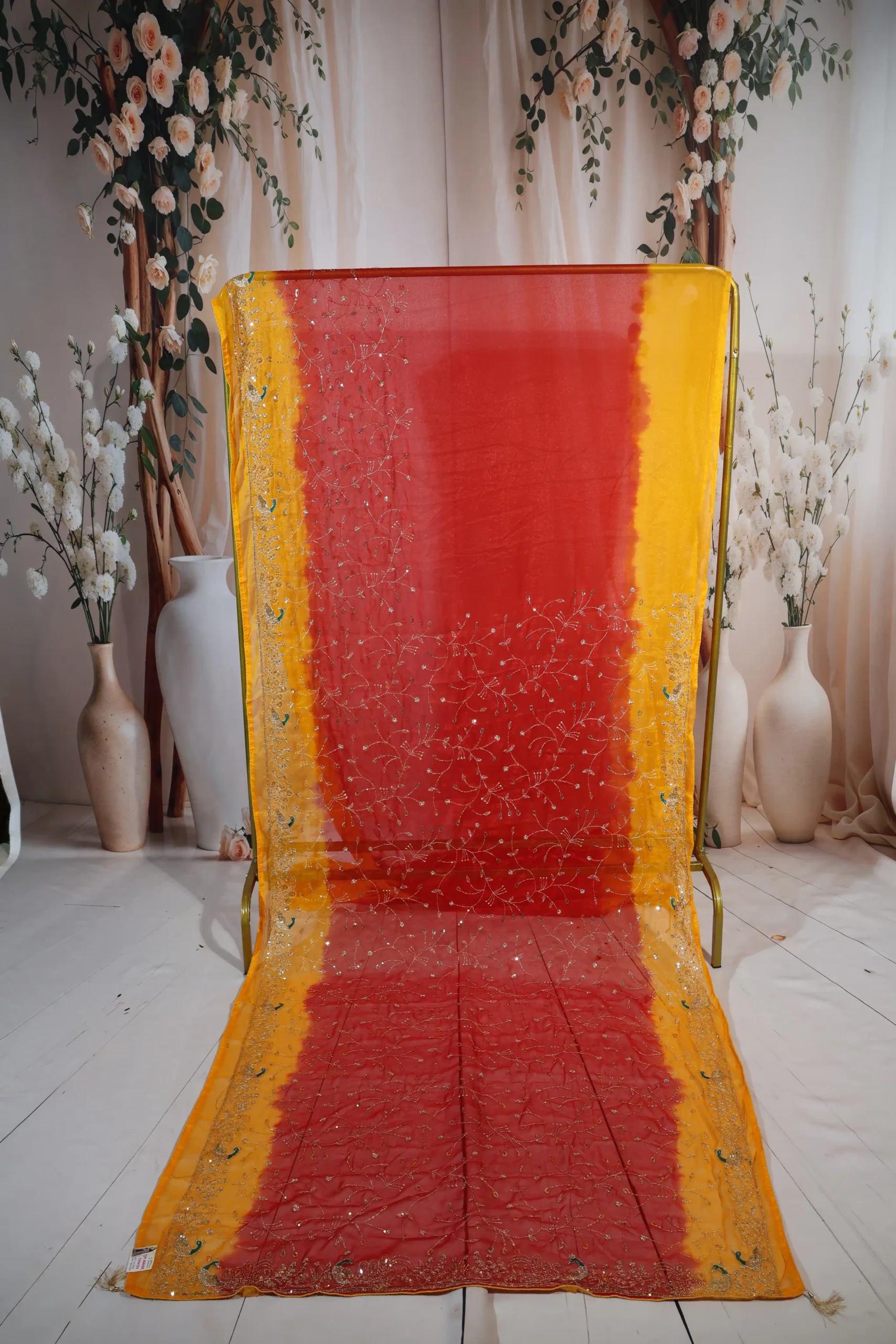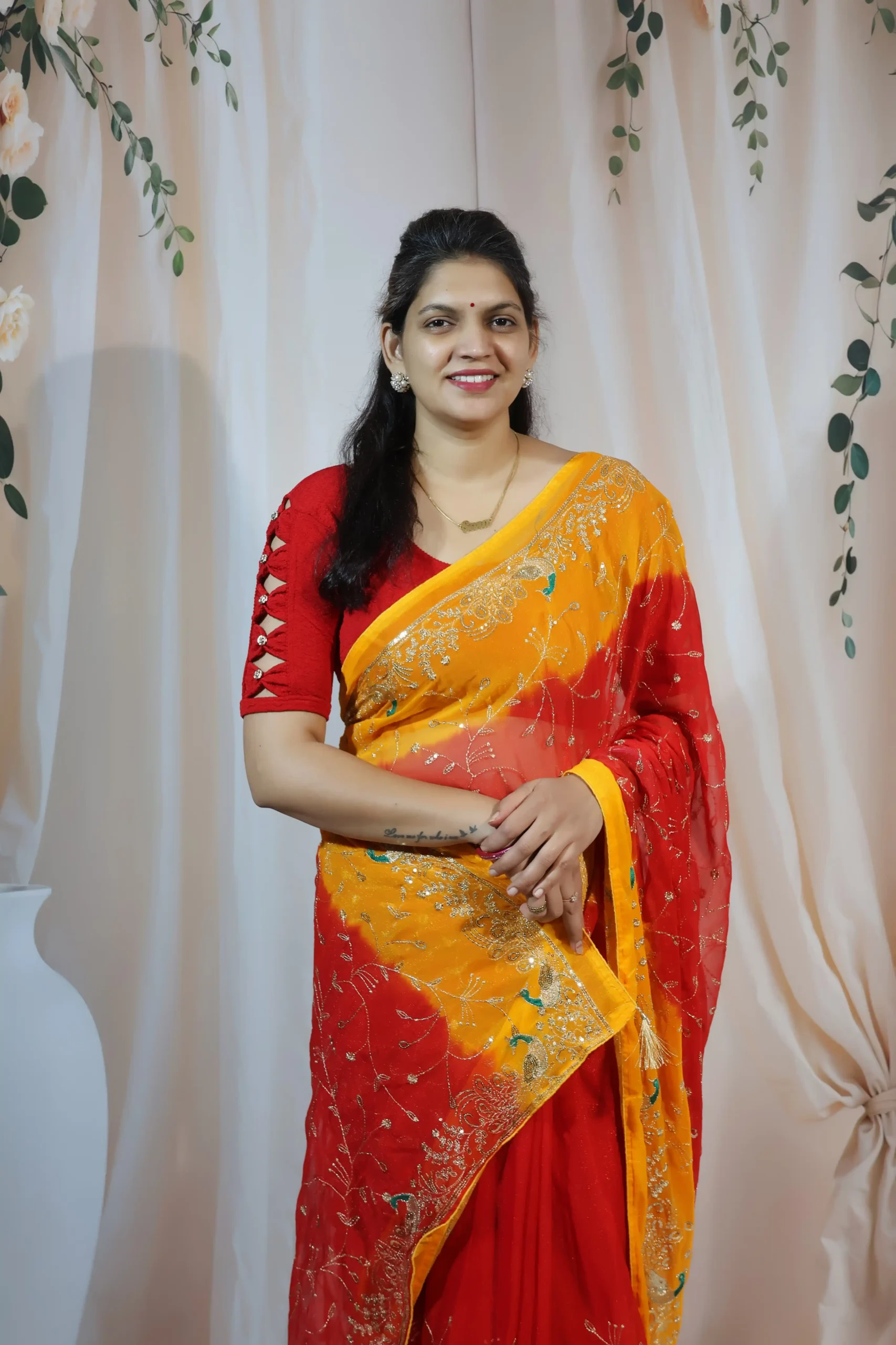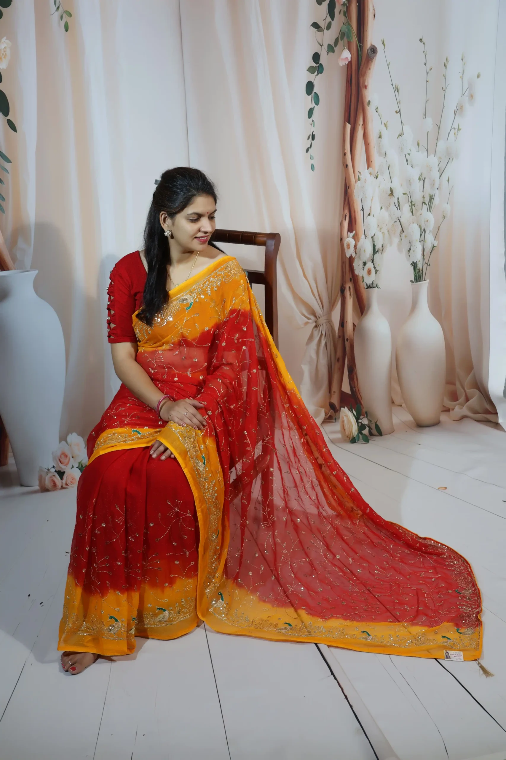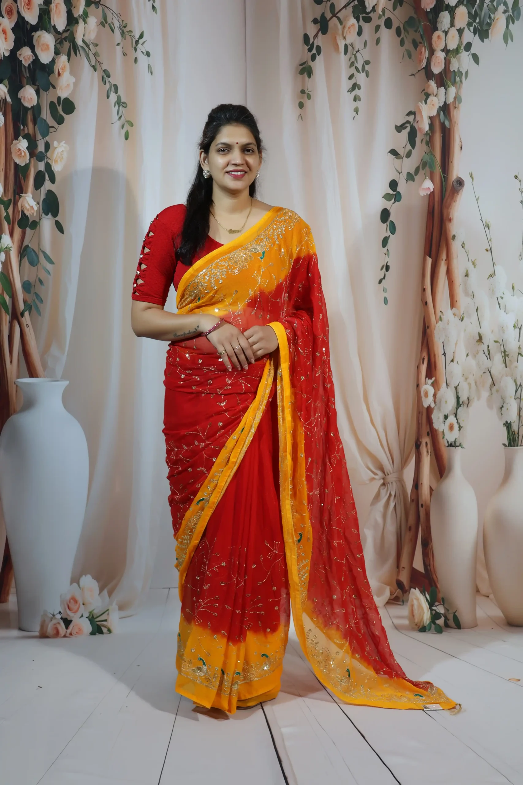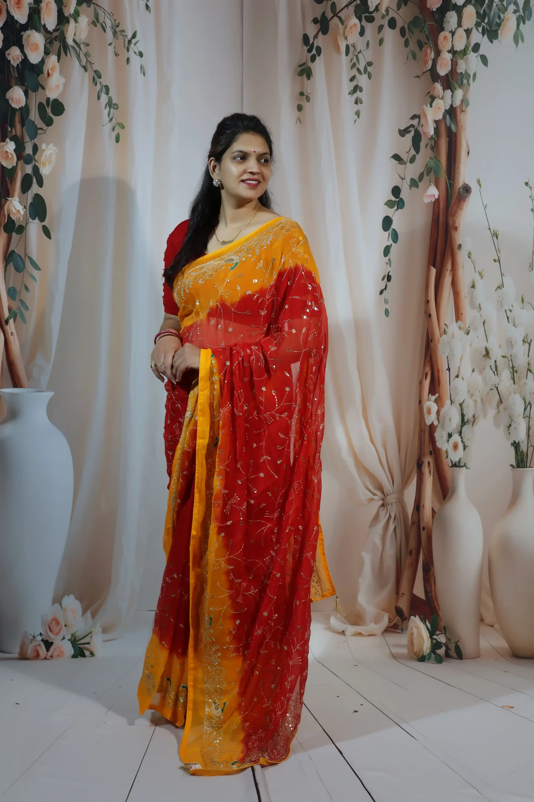 Red Yellow Simmer Fabric Rajpooti Saree with Jari Sequence Work | Traditional Party Wear Saree 6.25m