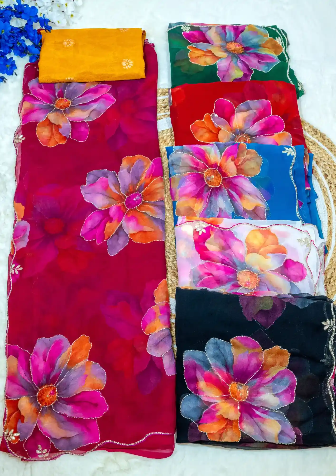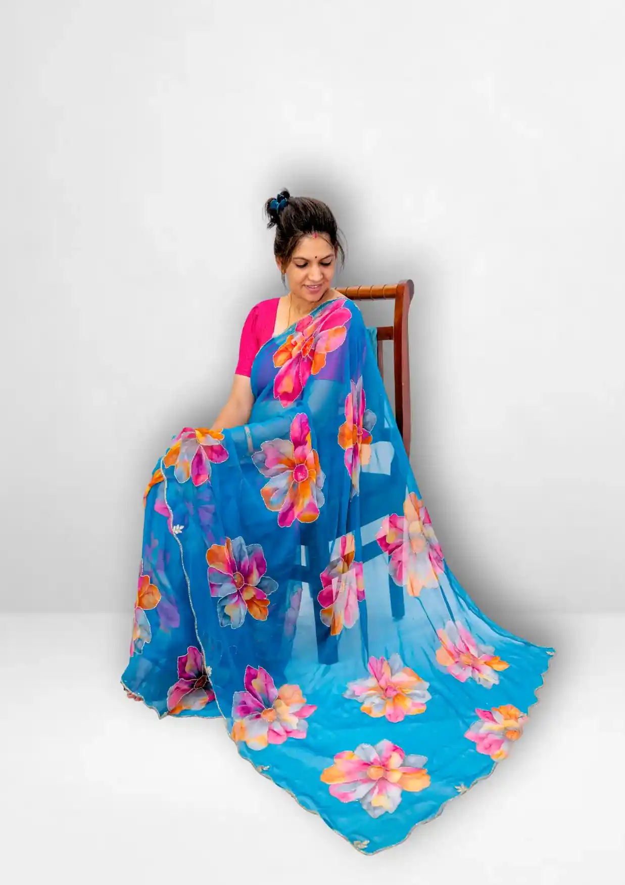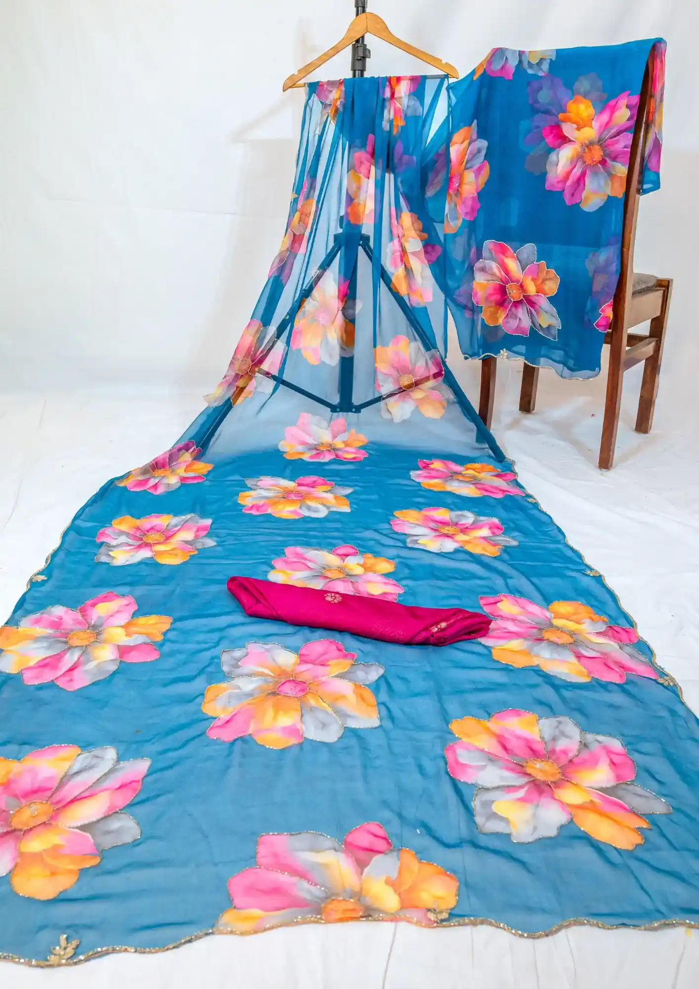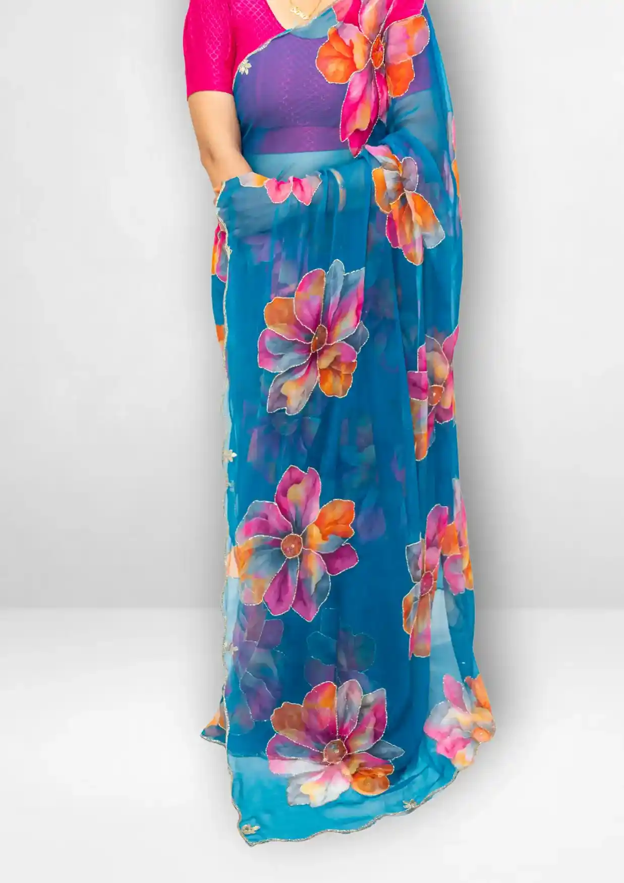 Teal Blue Georgette Handwork Saree with Elegant Floral Print | Lightweight Designer Saree 6.25m