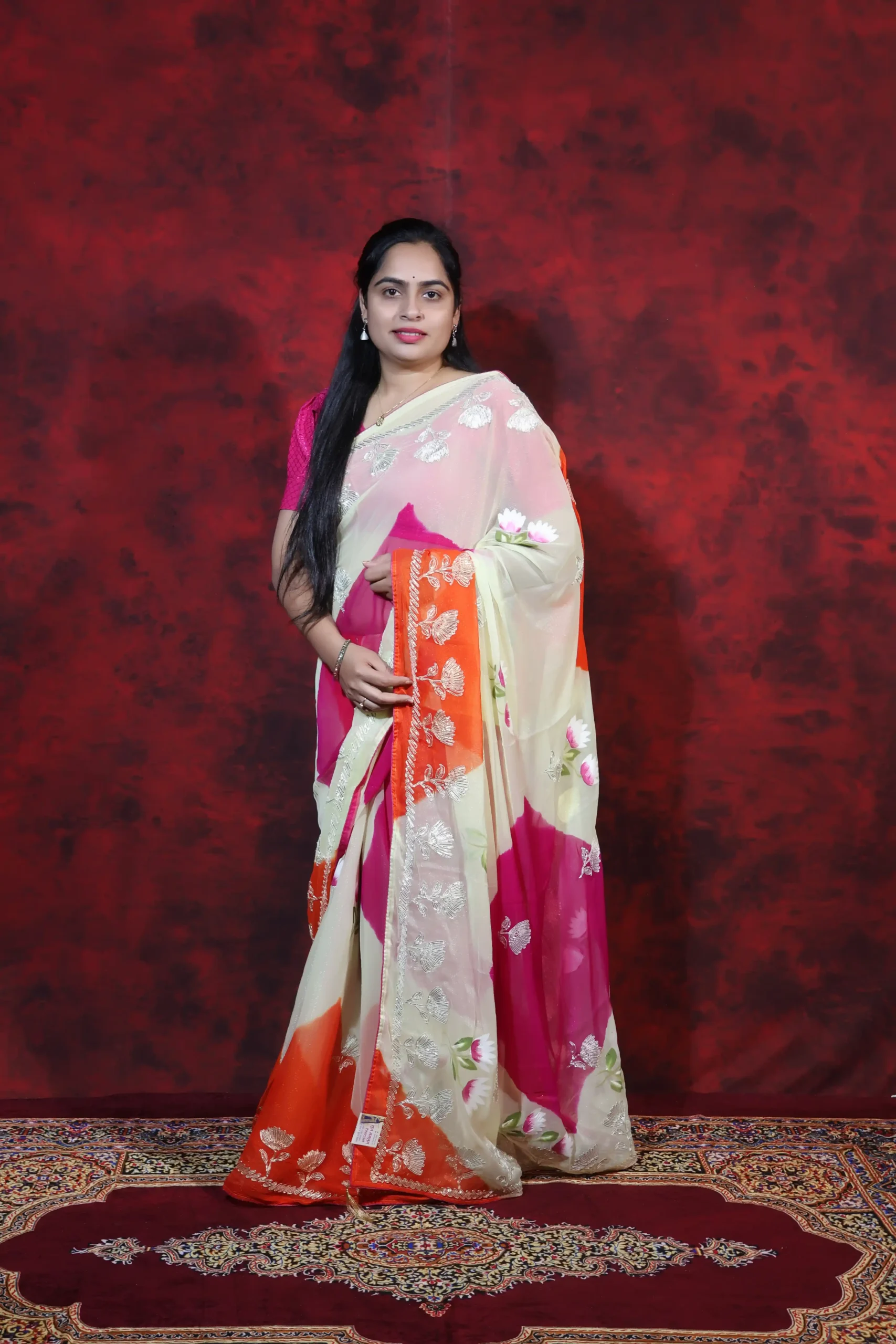 White–Orange–Rani Simmer Fabric Saree with Kachhi Gotta Patti Work | Elegant Designer Saree 6.25m