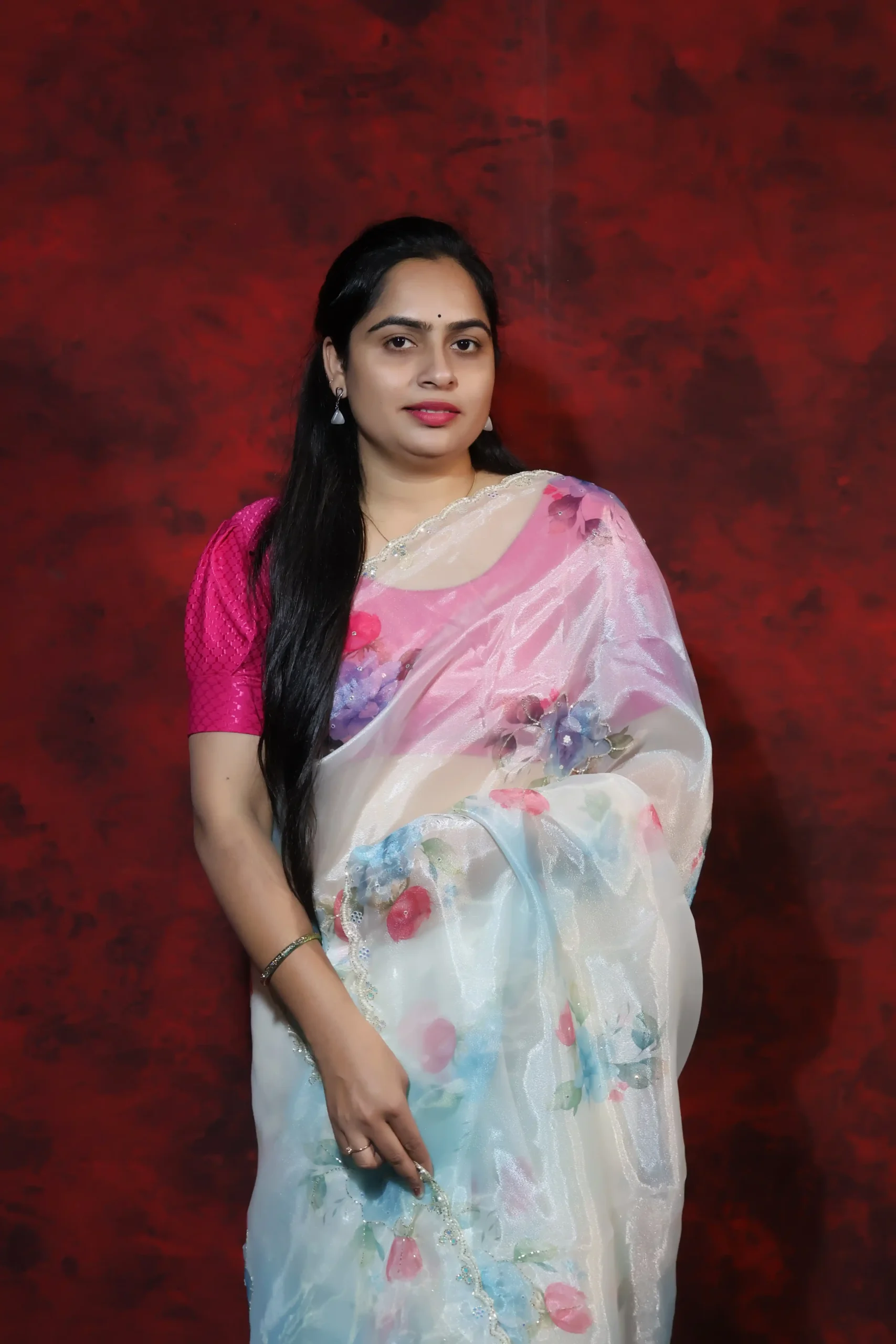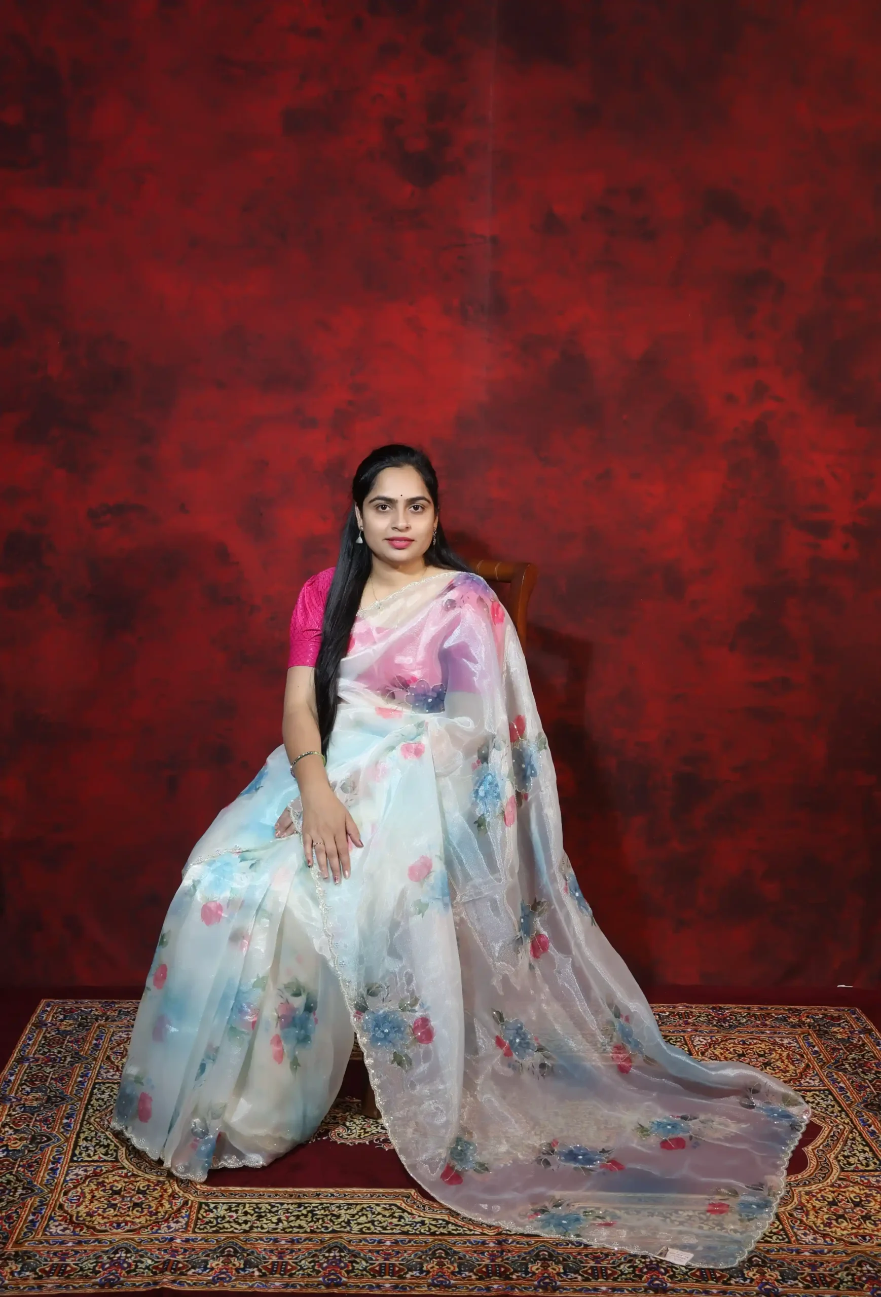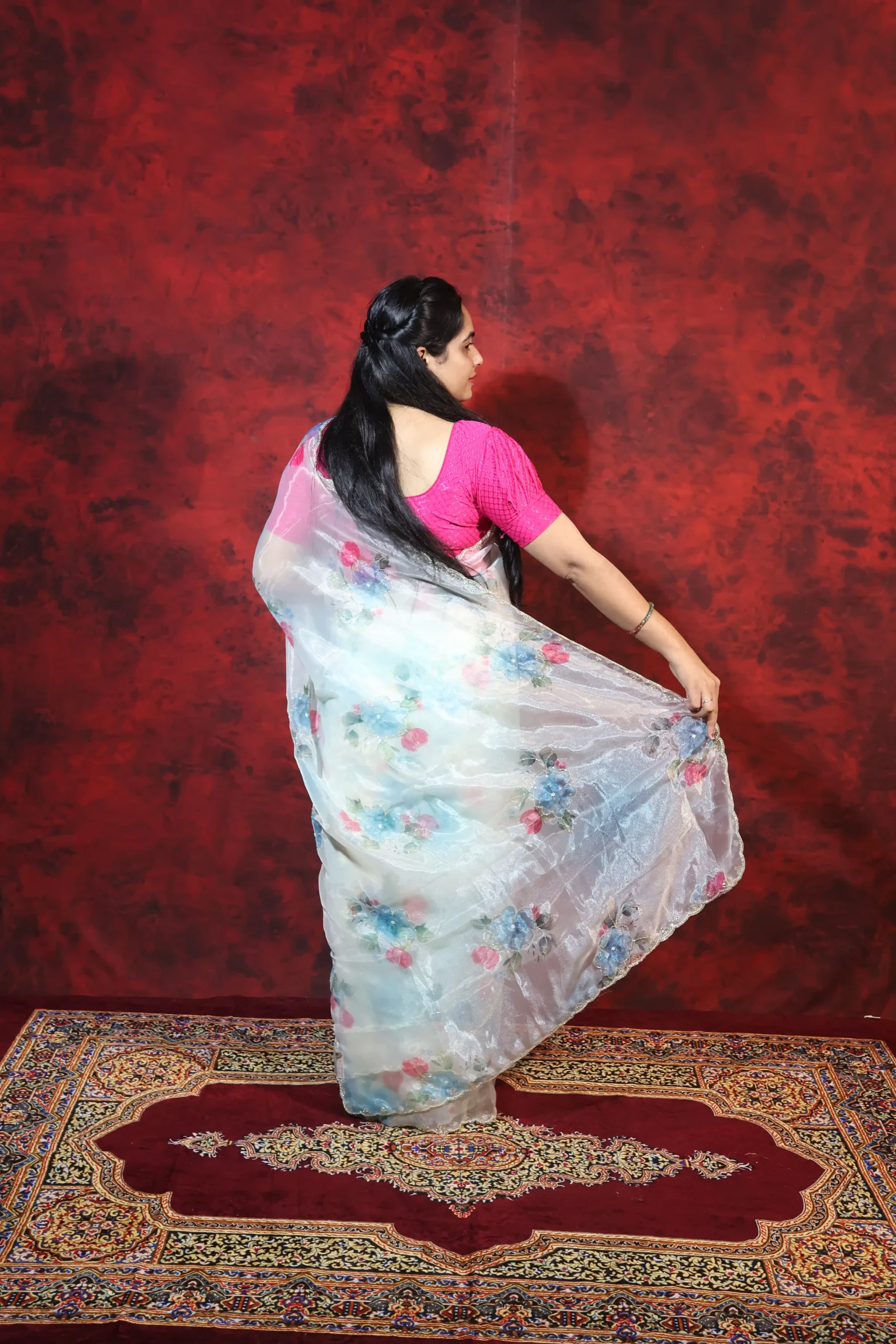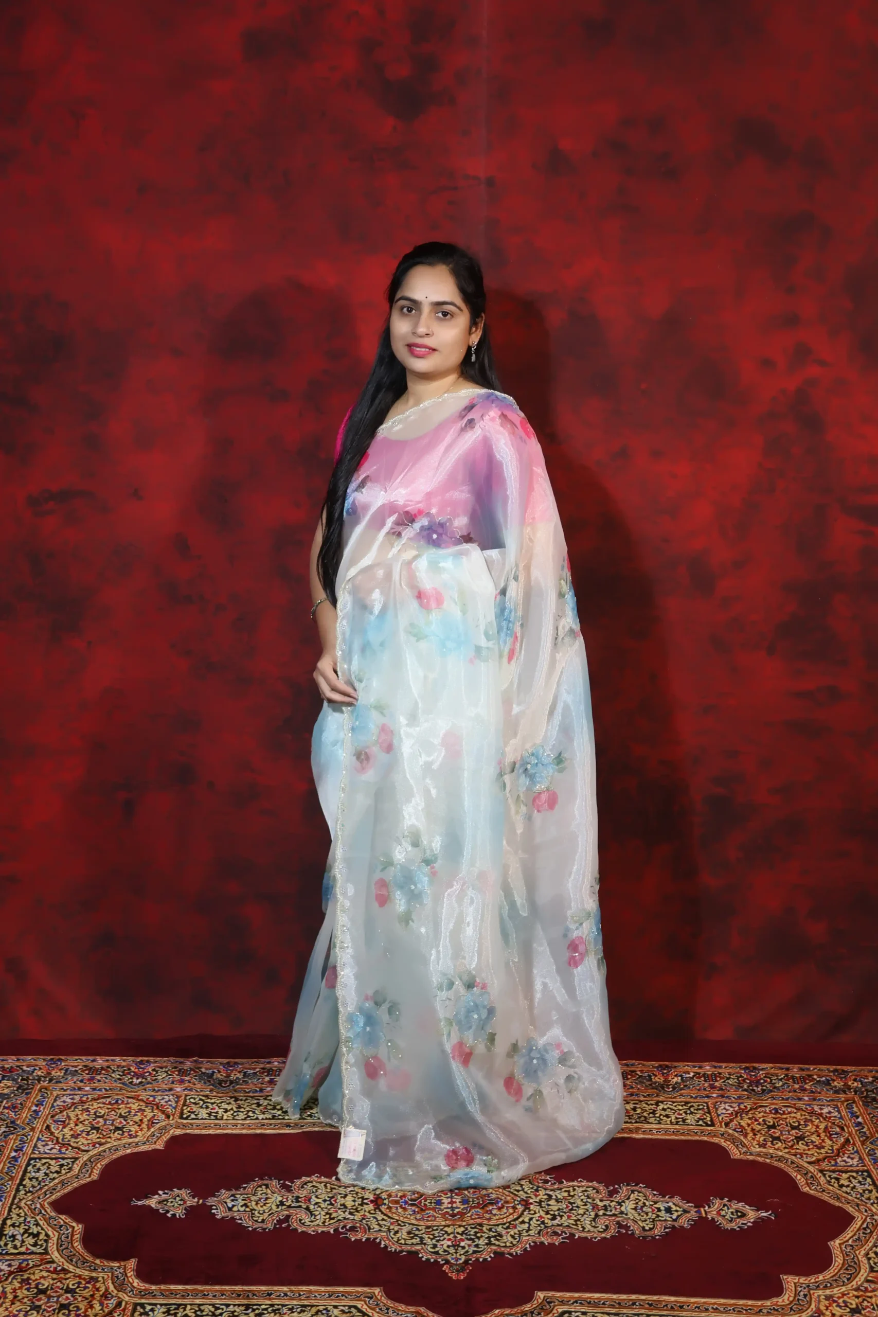 Beautiful White Semi Organza saree featuring premium Cut Dana handwork with a stunning red and blue floral print. Lightweight, stylish, and perfect for parties, festive events, and special occasions.