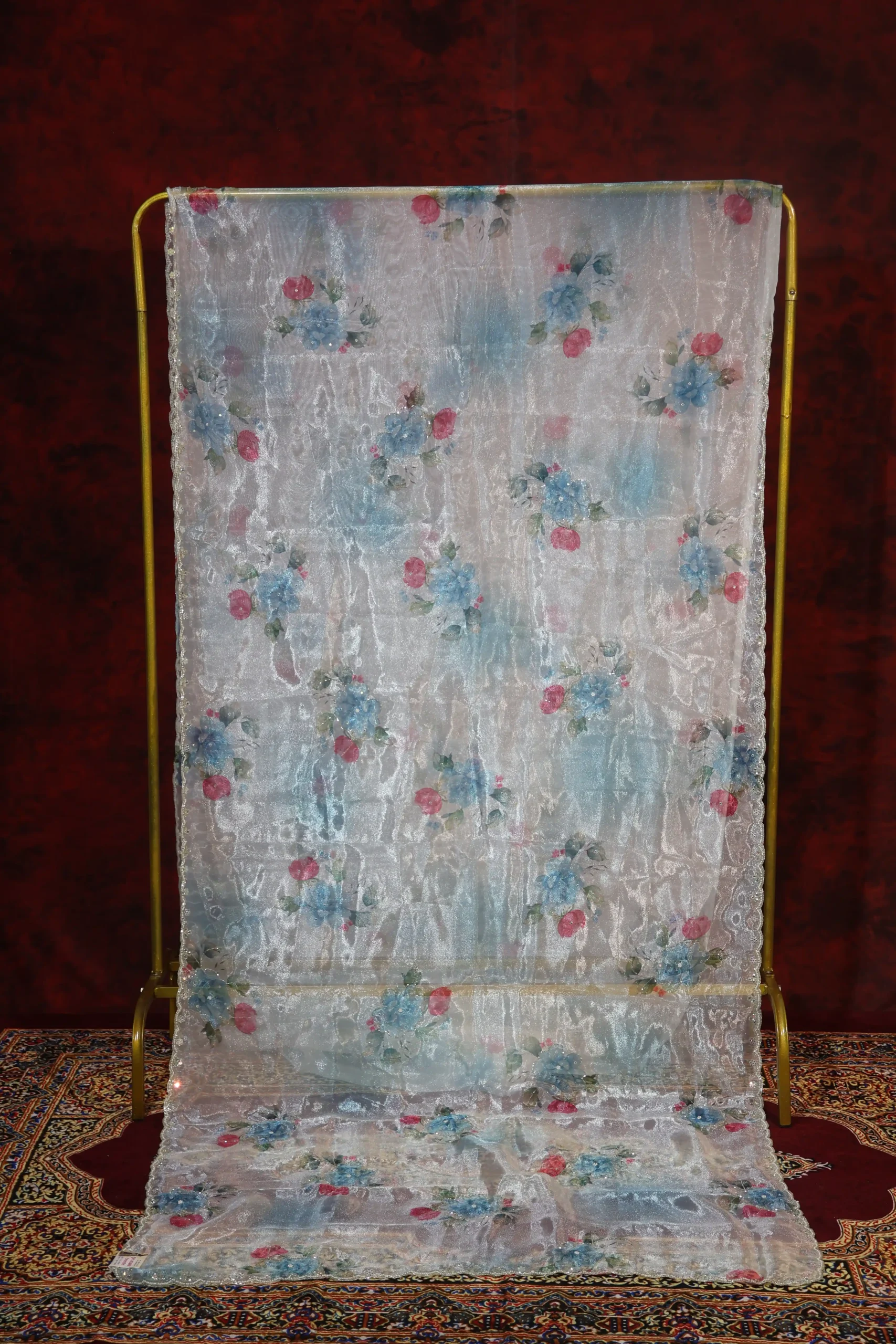 White Semi Organza Saree with Cut Dana Work & Red–Blue Floral Print | Elegant Designer Saree 6.25m