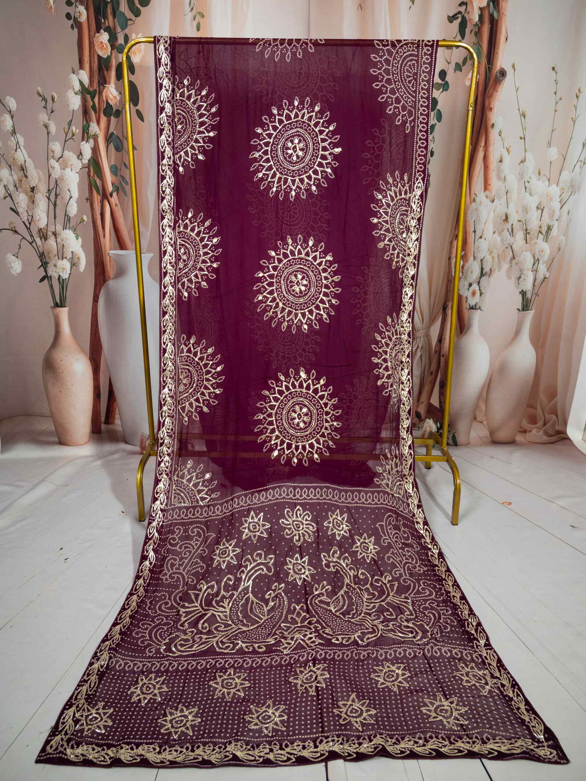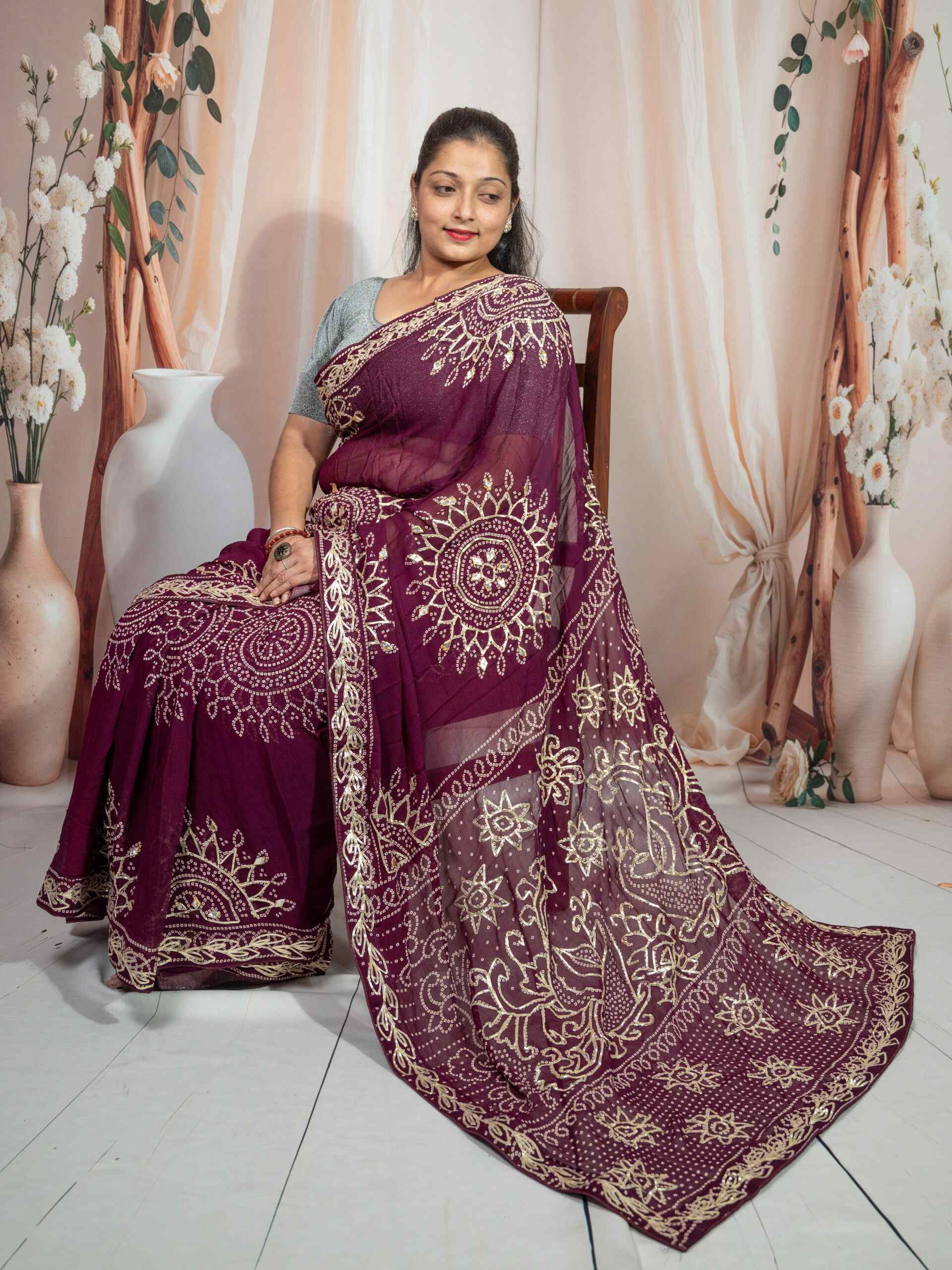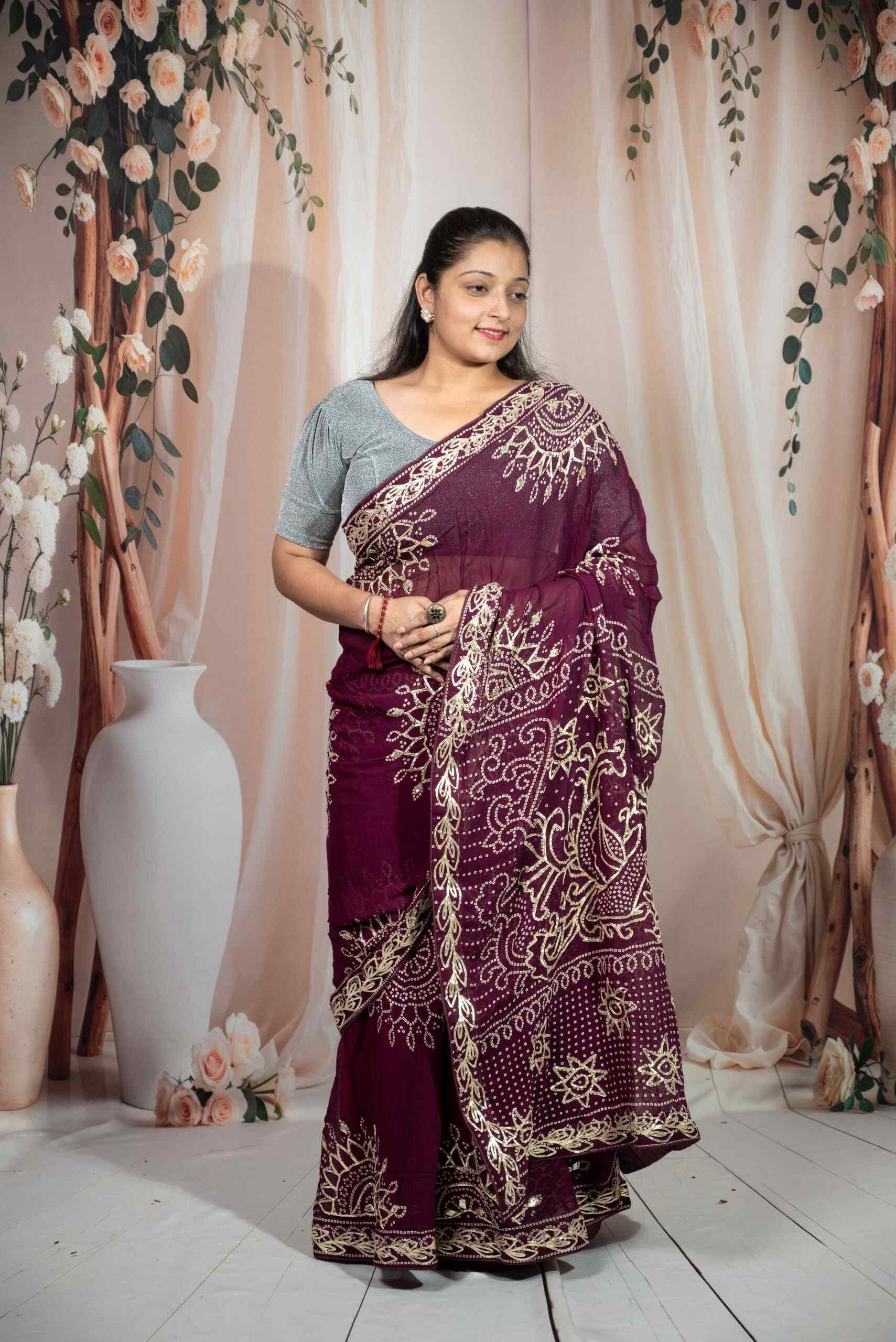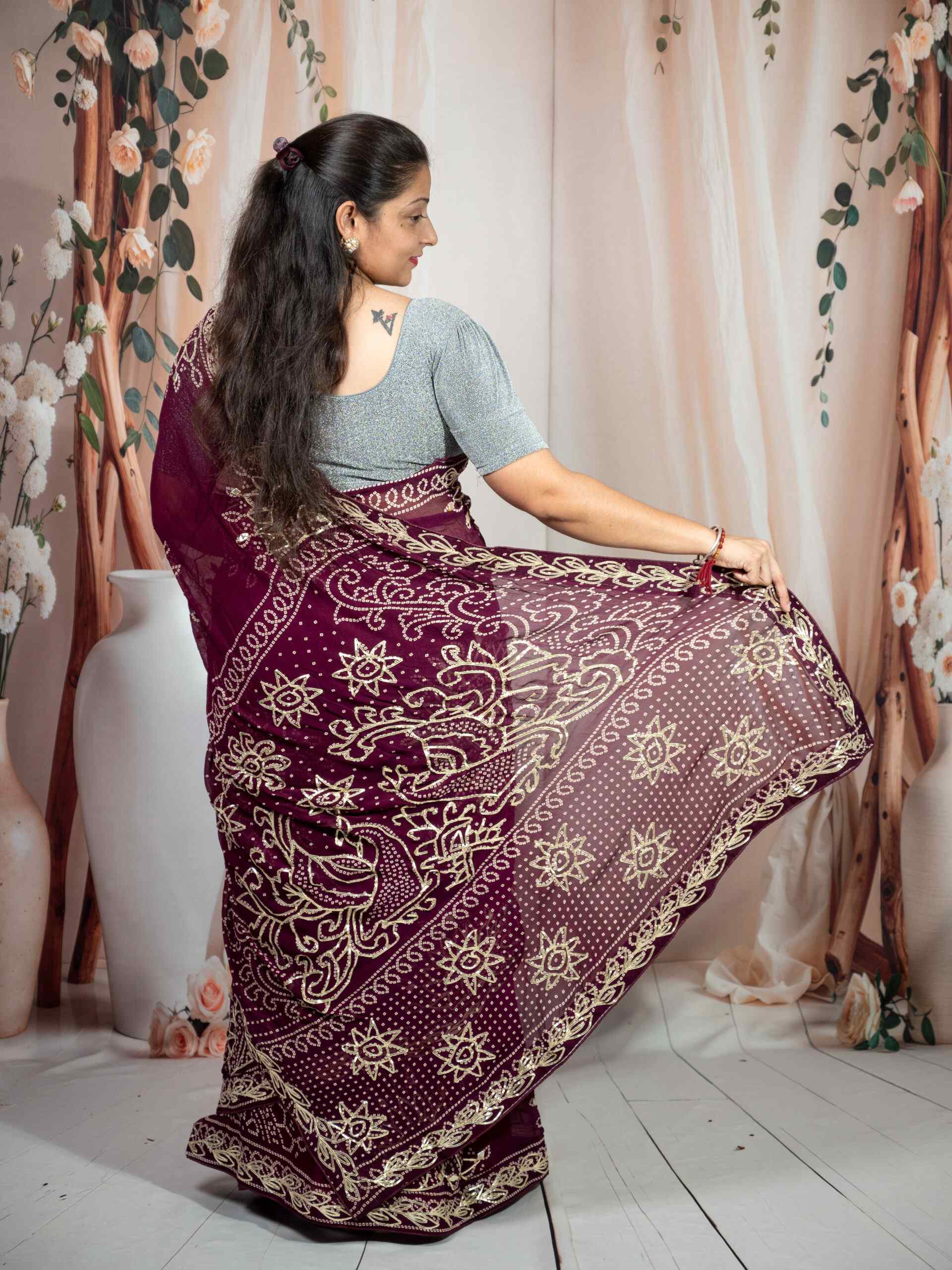 Wine Pure Georgette Saree with Bandhani Pattern & Kachhi Gota Patti Work | Traditional Designer Saree 6.25m