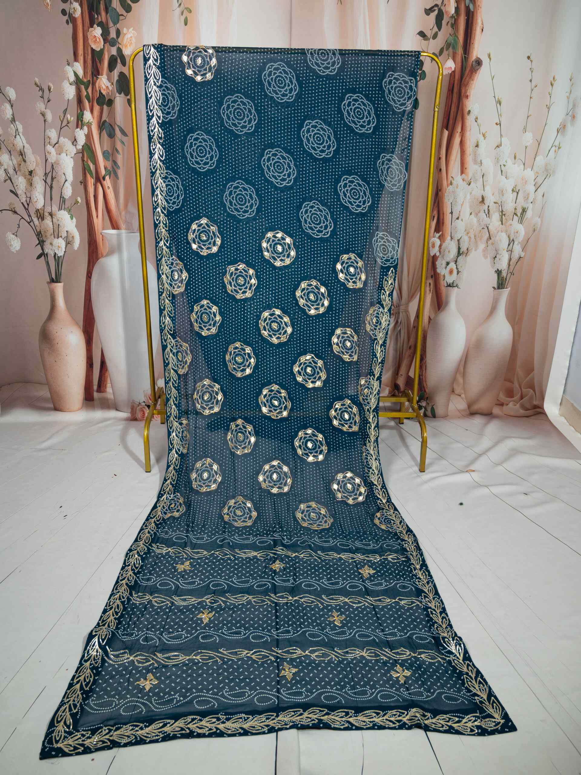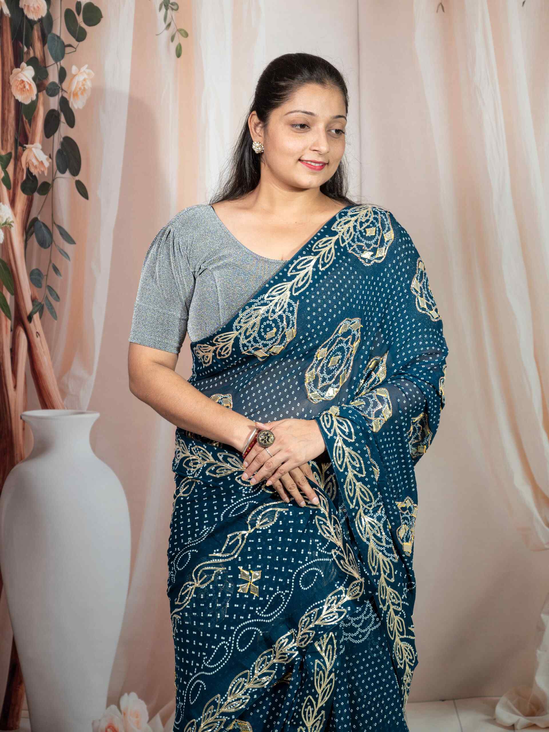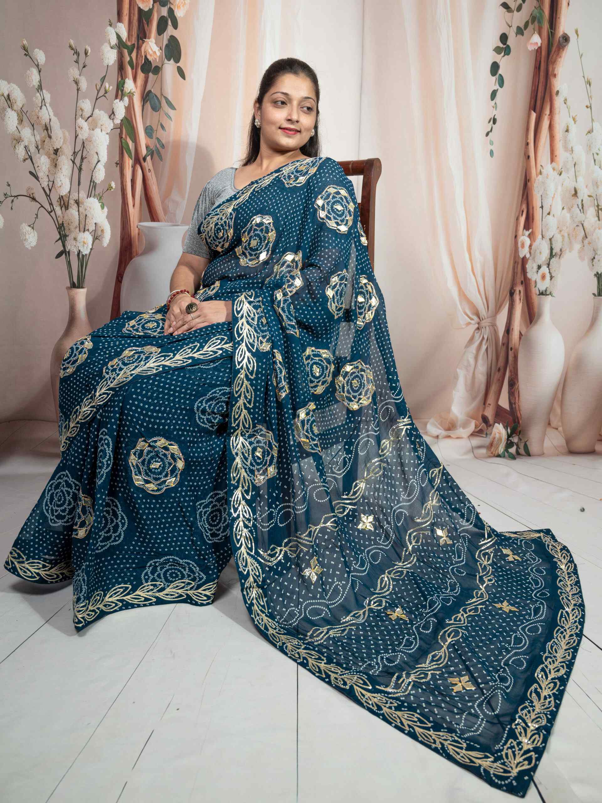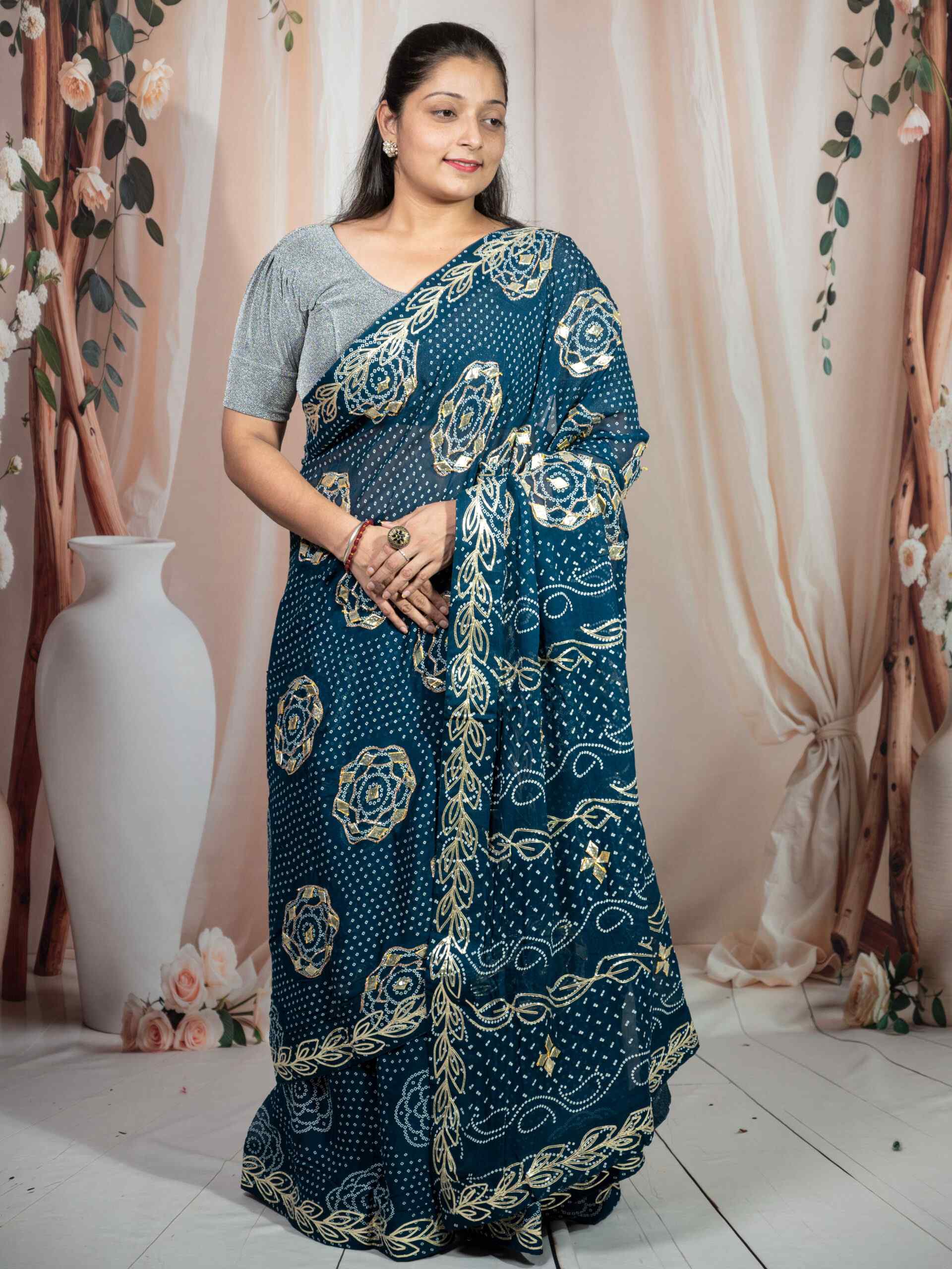 Bring home the richness of tradition with this stunning .Bandhej Saree crafted in soft and flowy Royal Georgette fabric. Adorned with intricate Kachi Gota Patti handwork, this saree beautifully blends Rajasthani heritage with modern grace. The traditional Bandhej (tie-dye) pattern enhances its ethnic charm, making it perfect for festive occasions, weddings, and cultural gatherings.