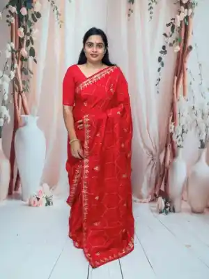 This saree is a must-have if you love traditional styles with a modern touch of shine and craftsmanship.