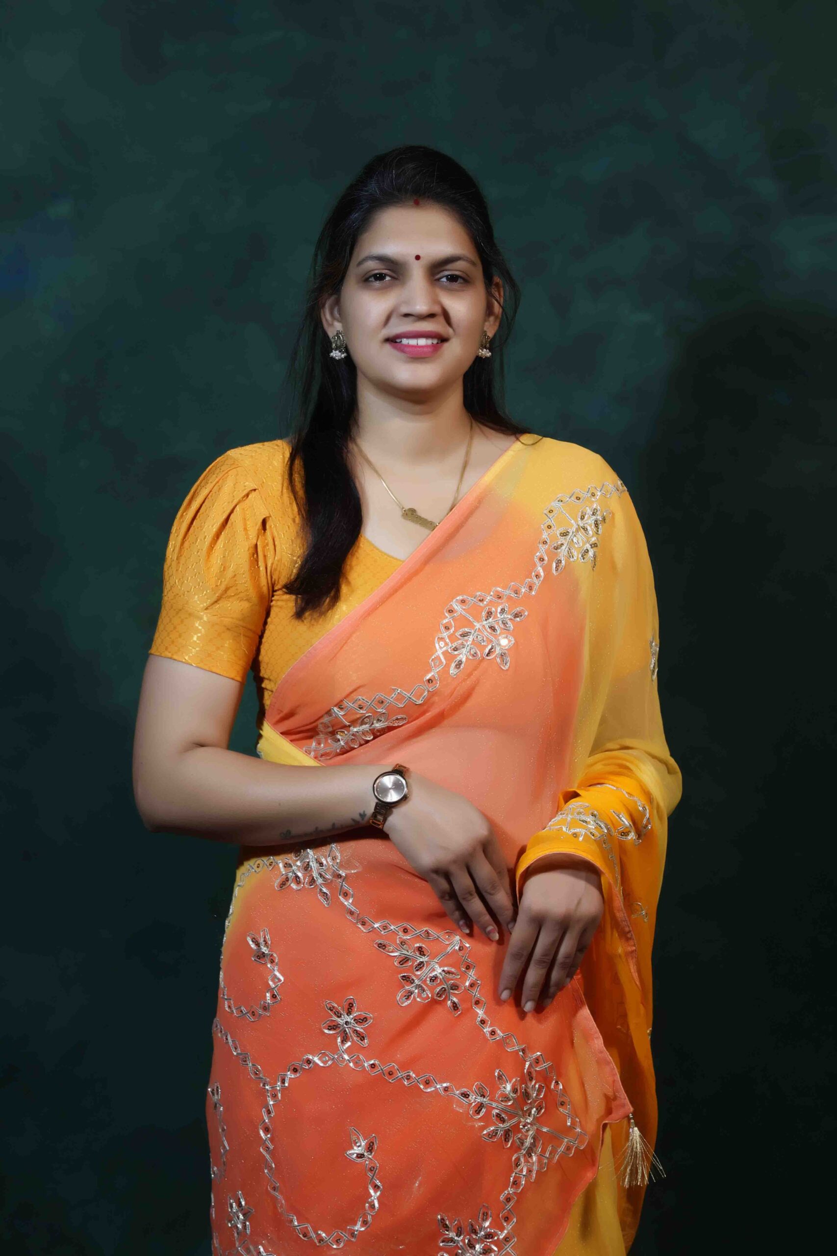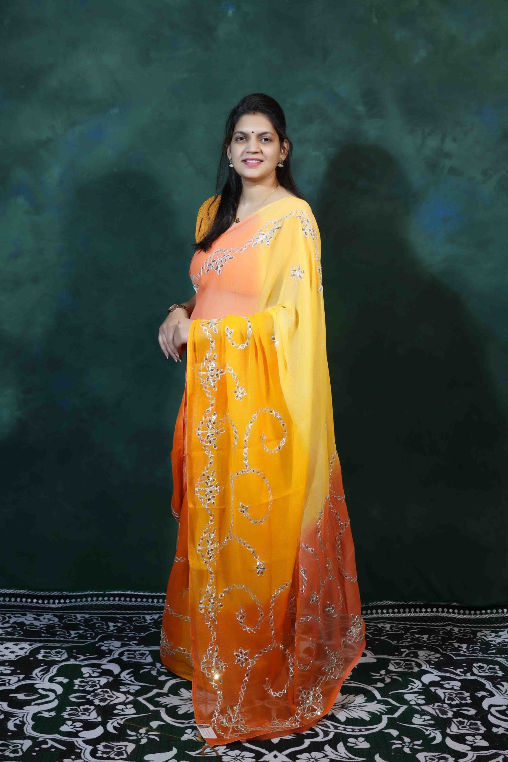 The saree is adorned with authentic Kachhi Gotta Patti work, known for its rich sparkle and traditional elegance. The vibrant combination of yellow and orange adds a festive brightness, making it an ideal pick for haldi ceremonies, weddings, pooja functions, cultural programs, and family gatherings.