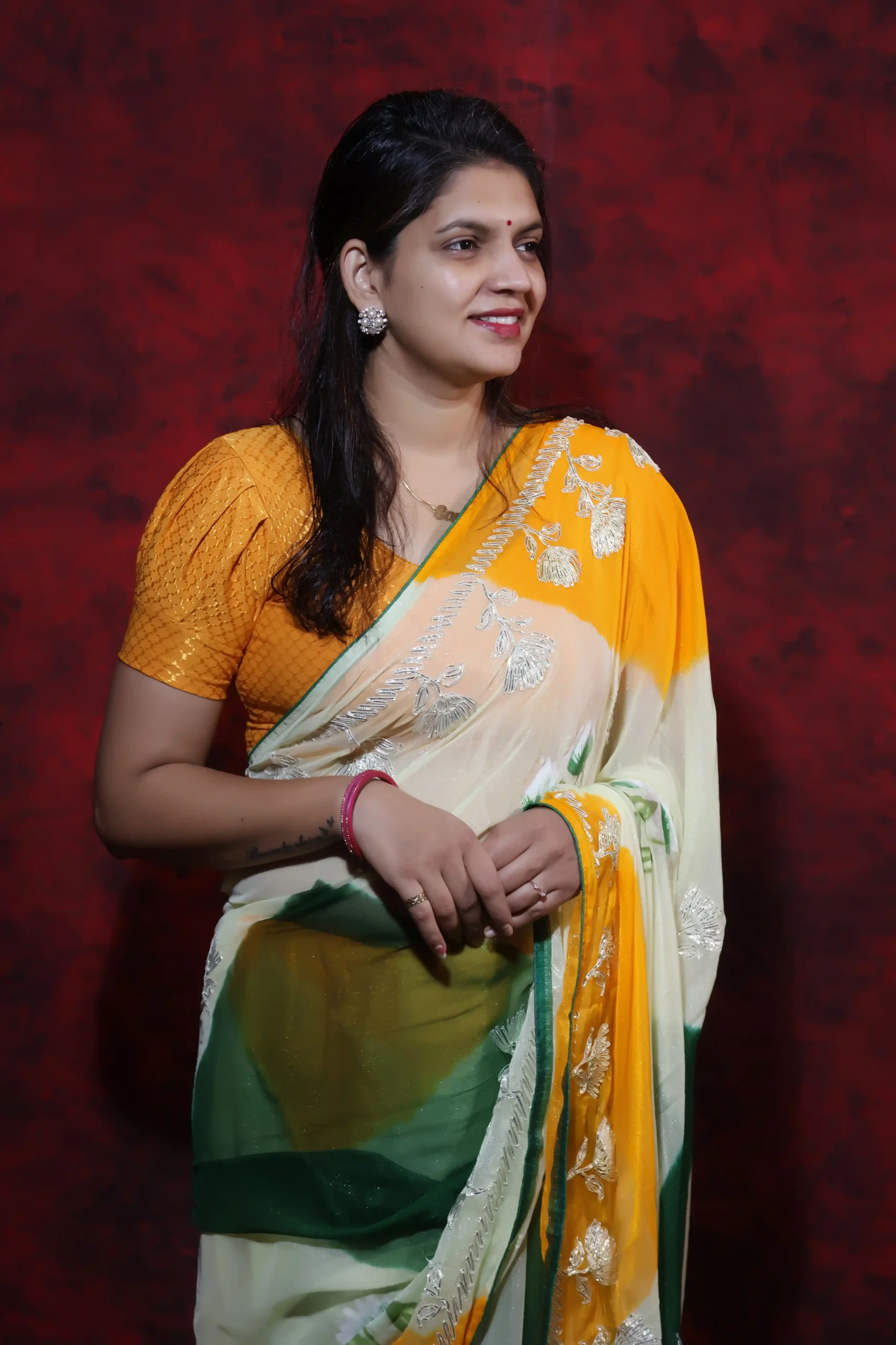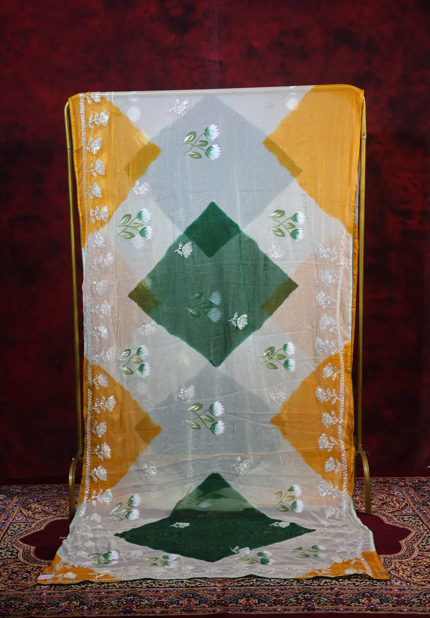 White–Yellow–Green Simmer Fabric Saree with Kachhi Gotta Patti Work | Elegant Designer Saree 6.25m